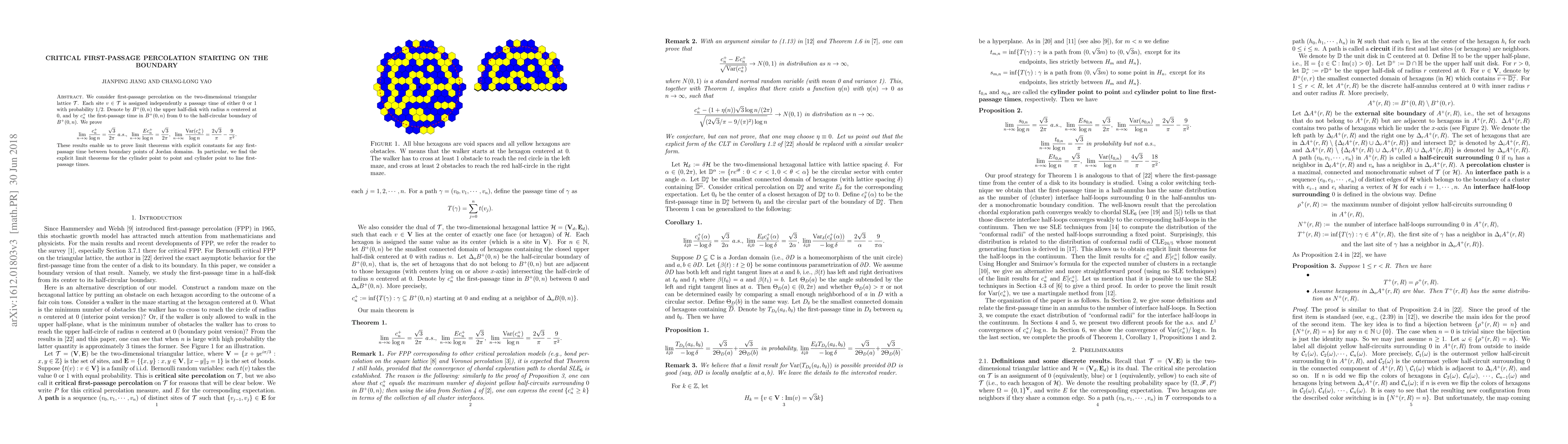 We consider first-passage percolation on the two-dimensional triangular lattice $\mathcal{T}$. Each site $v\in\mathcal{T}$ is assigned independently a passage time of either $0$ or $1$ with probability $1/2$. Denote by $B^+(0,n)$ the upper half-disk with radius $n$ centered at $0$, and by $c_n^+$ the first-passage time in $B^+(0,n)$ from $0$ to the half-circular boundary of $B^+(0,n)$. We prove \[\lim_{n\rightarrow\infty}\frac{c_n^+}{\log n}=\frac{\sqrt{3}}{2\pi}~ a.s.,~\lim_{n\rightarrow\infty}\frac{E c_n^+}{\log n}=\frac{\sqrt{3}}{2\pi},~\lim_{n\rightarrow\infty}\frac{\mathrm{Var}(c_n^+)}{\log n}=\frac{2\sqrt{3}}{\pi}-\frac{9}{\pi^2}.\] These results enable us to prove limit theorems with explicit constants for any first-passage time between boundary points of Jordan domains. In particular, we find the explicit limit theorems for the cylinder point to point and cylinder point to line first-passage times.