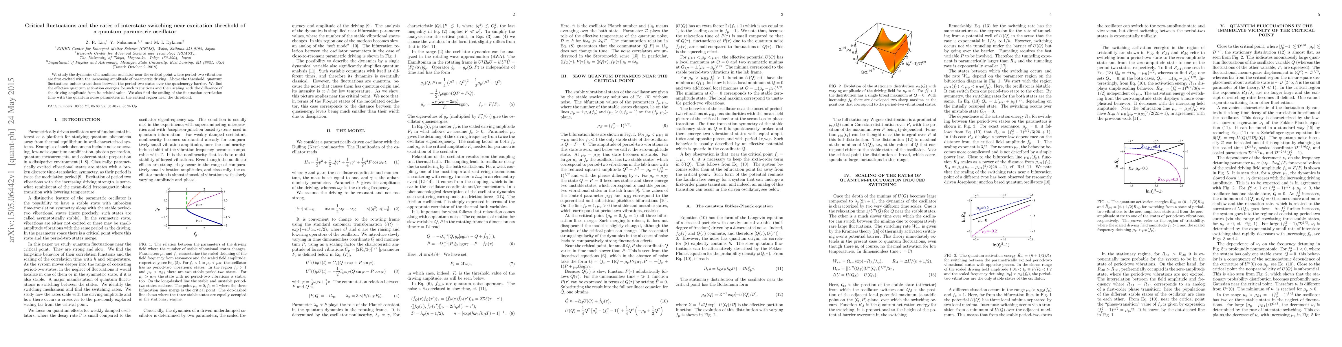 This paper investigates the dynamics of a quantum parametric oscillator near its excitation threshold, focusing on critical fluctuations and interstate switching rates. It determines the effective quantum activation energies for transitions between period-two states and analyzes the scaling of fluctuation correlation times with quantum noise parameters.