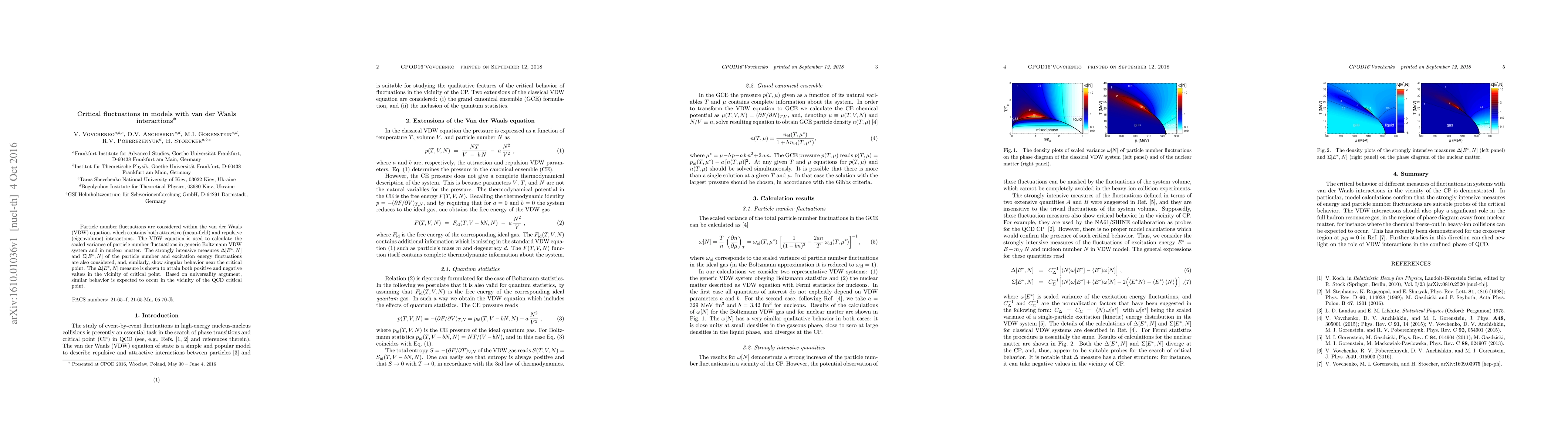 This paper investigates particle number fluctuations in systems described by the van der Waals equation, revealing singular behavior near the critical point. The study extends to measures of excitation energy fluctuations, showing both positive and negative values near the critical point, suggesting similar phenomena near the QCD critical point based on universality arguments.