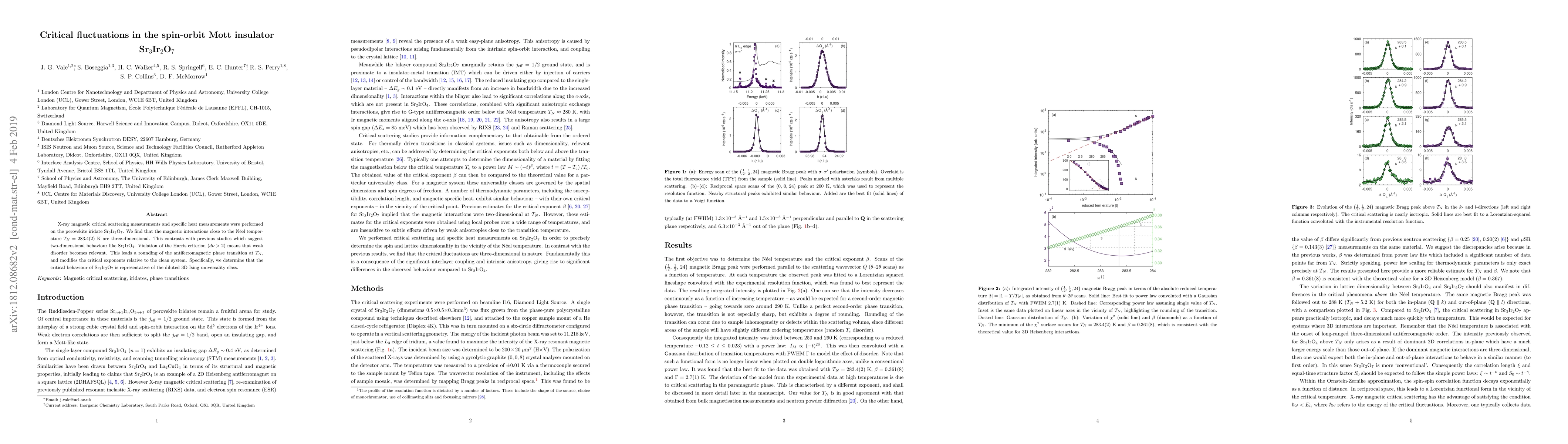 X-ray magnetic critical scattering measurements and specific heat measurements were performed on the perovskite iridate Sr$_3$Ir$_2$O$_7$. We find that the magnetic interactions close to the N\'{e}el temperature $T_N$ = 283.4(2) K are three-dimensional. This contrasts with previous studies which suggest two-dimensional behaviour like Sr$_2$IrO$_4$. Violation of the Harris criterion ($d\nu>2$) means that weak disorder becomes relevant. This leads a rounding of the antiferromagnetic phase transition at $T_N$, and modifies the critical exponents relative to the clean system. Specifically, we determine that the critical behaviour of Sr$_3$Ir$_2$O$_7$ is representative of the diluted 3D Ising universality class.