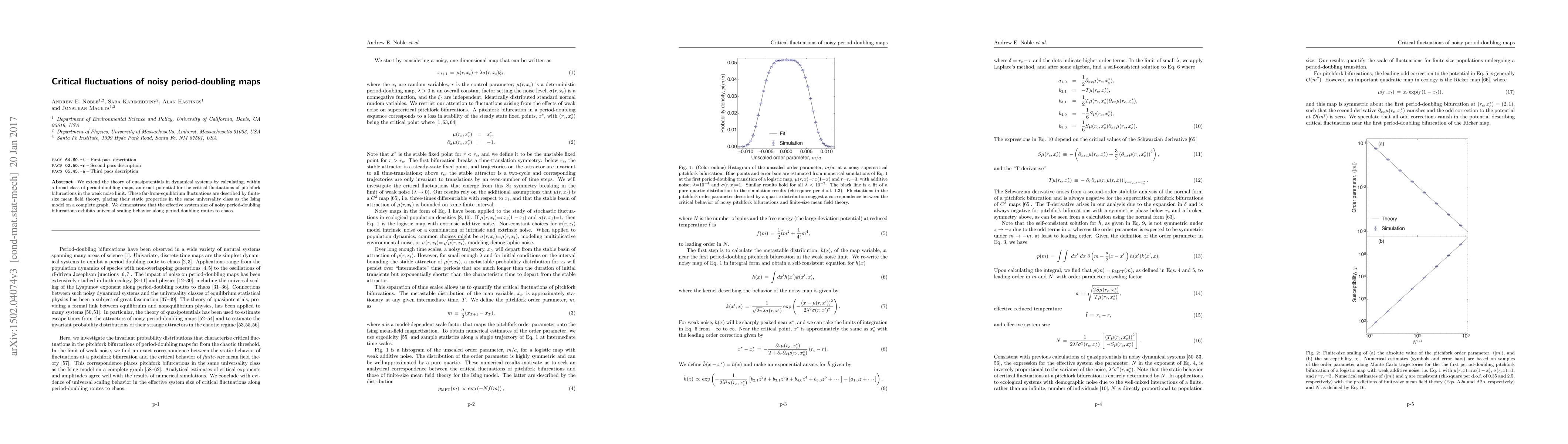We extend the theory of quasipotentials in dynamical systems by calculating, within a broad class of period-doubling maps, an exact potential for the critical fluctuations of pitchfork bifurcations in the weak noise limit. These far-from-equilibrium fluctuations are described by finite-size mean field theory, placing their static properties in the same universality class as the Ising model on a complete graph. We demonstrate that the effective system size of noisy period-doubling bifurcations exhibits universal scaling behavior along period-doubling routes to chaos.