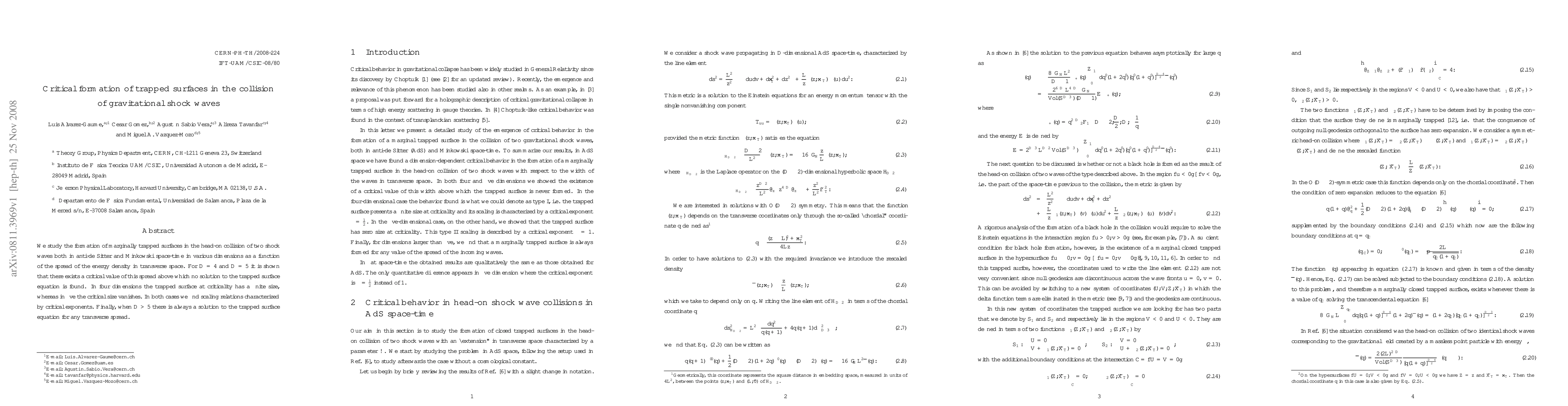 We study the formation of marginally trapped surfaces in the head-on collision of two shock waves both in anti-de Sitter and Minkowski space-time in various dimensions as a function of the spread of the energy density in transverse space. For D=4 and D=5 it is shown that there exists a critical value of this spread above which no solution to the trapped surface equation is found. In four dimensions the trapped surface at criticality has a finite size, whereas in five the critical size vanishes. In both cases we find scaling relations characterized by critical exponents. Finally, when D>5 there is always a solution to the trapped surface equation for any transverse spread.