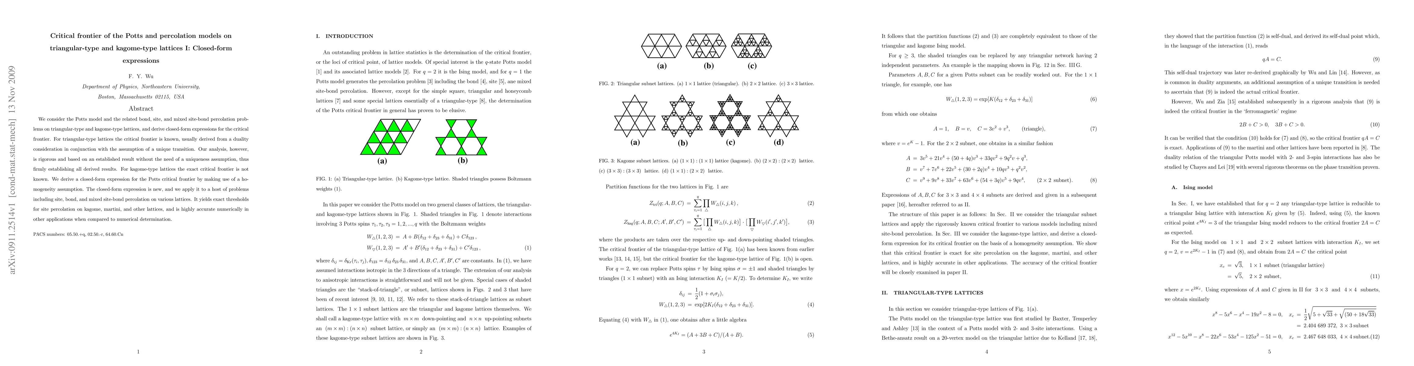 We consider the Potts model and the related bond, site, and mixed site-bond percolation problems on triangular-type and kagome-type lattices, and derive closed-form expressions for the critical frontier. For triangular-type lattices the critical frontier is known, usually derived from a duality consideration in conjunction with the assumption of a unique transition. Our analysis, however, is rigorous and based on an established result without the need of a uniqueness assumption, thus firmly establishing all derived results. For kagome-type lattices the exact critical frontier is not known. We derive a closed-form expression for the Potts critical frontier by making use of a homogeneity assumption. The closed-form expression is new, and we apply it to a host of problems including site, bond, and mixed site-bond percolation on various lattices. It yields exact thresholds for site percolation on kagome, martini, and other lattices, and is highly accurate numerically in other applications when compared to numerical determination.