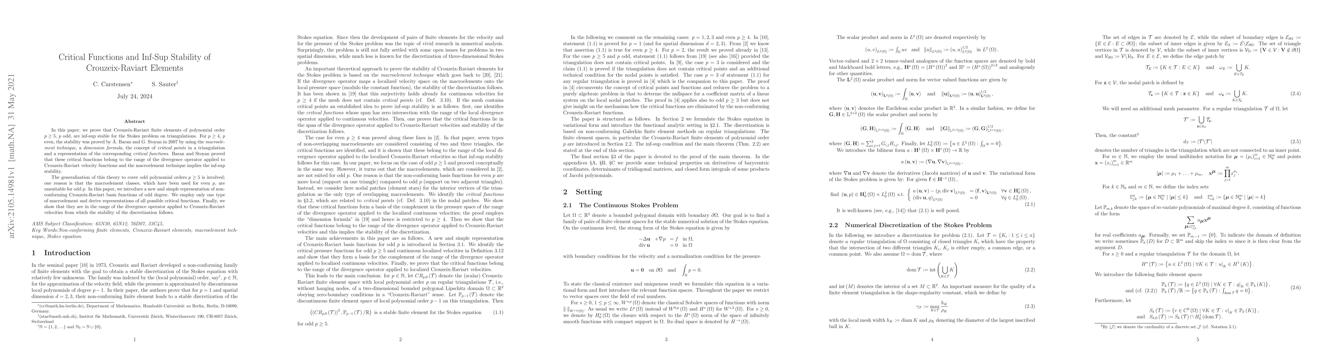In this paper, we prove that Crouzeix-Raviart finite elements of polynomial order $p\geq5$, $p$ odd, are inf-sup stable for the Stokes problem on triangulations. For $p\geq4$, $p$ even, the stability was proved by \'{A}. Baran and G. Stoyan in 2007 by using the \textit{macroelement technique,} a \textit{dimension formula}, the concept of \textit{critical points} in a triangulation and a representation of the corresponding \textit{critical functions}. Baran and Stoyan proved that these critical functions belong to the range of the divergence operator applied to Crouzeix-Raviart velocity functions and the macroelement technique implies the inf-sup stability. The generalization of this theory to cover odd polynomial orders $p\geq5$ is involved; one reason is that the macroelement classes, which have been used for even $p$, are unsuitable for odd $p$. In this paper, we introduce a new and simple representation of non-conforming Crouzeix-Raviart basis functions of odd degree. We employ only one type of macroelement and derive representations of all possible critical functions. Finally, we show that they are in the range of the divergence operator applied to Crouzeix-Raviart velocities from which the stability of the discretization follows.