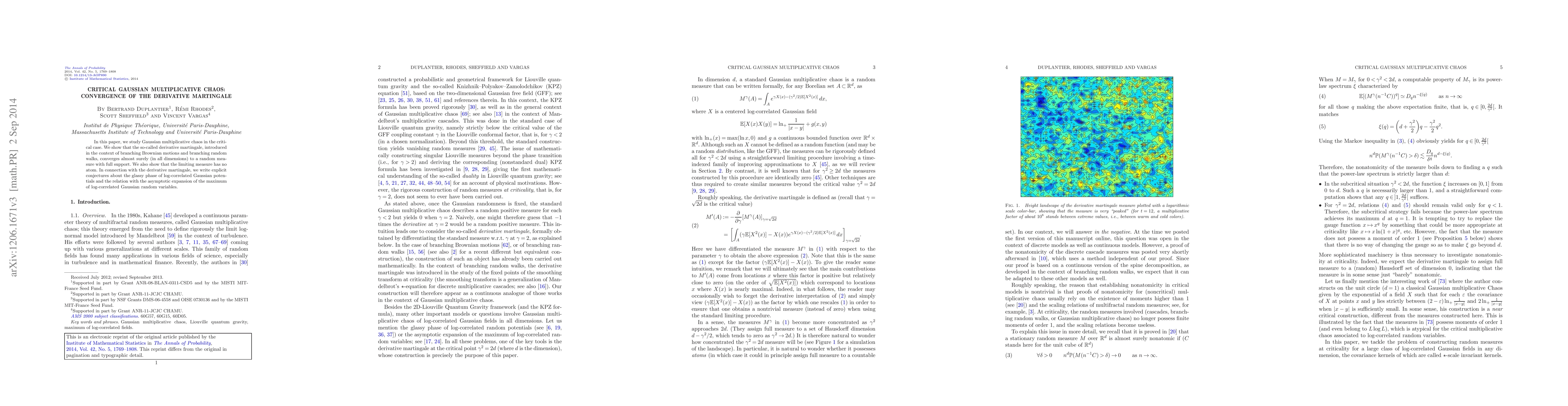 This paper investigates Gaussian multiplicative chaos in the critical case, demonstrating that the derivative martingale converges almost surely to a random measure with full support and no atoms. It also proposes conjectures linking the derivative martingale to the glassy phase of log-correlated Gaussian potentials and the asymptotic behavior of their maxima.