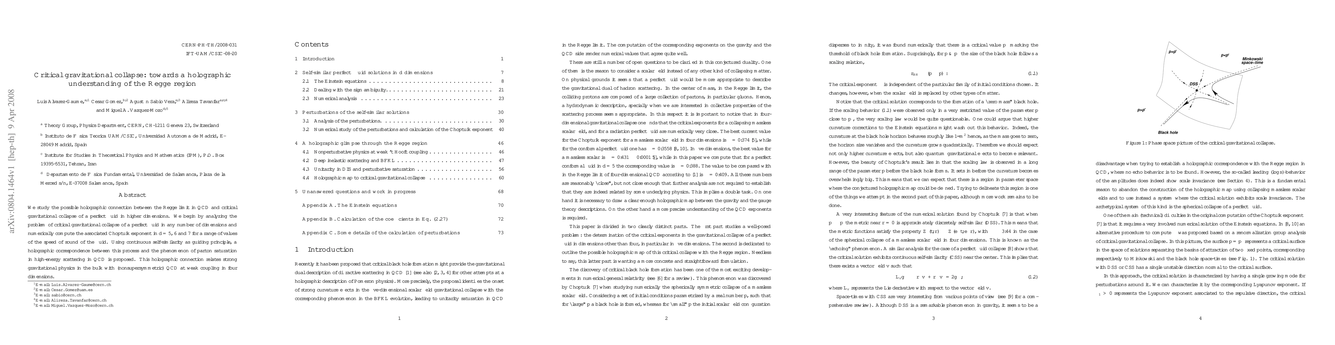 We study the possible holographic connection between the Regge limit in QCD and critical gravitational collapse of a perfect fluid in higher dimensions. We begin by analyzing the problem of critical gravitational collapse of a perfect fluid in any number of dimensions and numerically compute the associated Choptuik exponent in d=5, 6 and 7 for a range of values of the speed of sound of the fluid. Using continuous self-similarity as guiding principle, a holographic correspondence between this process and the phenomenon of parton saturation in high-energy scattering in QCD is proposed. This holographic connection relates strong gravitational physics in the bulk with (nonsupersymmetric) QCD at weak coupling in four dimensions.
