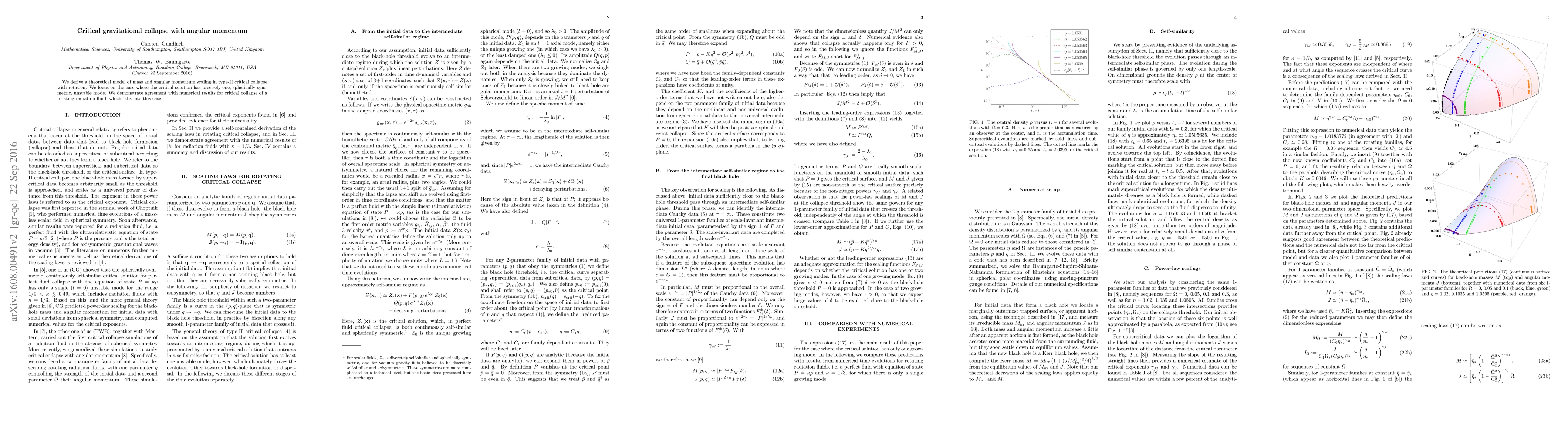This paper develops a theoretical model for mass and angular momentum scaling in type-II critical gravitational collapse with rotation, showing strong agreement with numerical simulations for rotating radiation fluid collapse. The model specifically addresses scenarios with a single, unstable, spherically symmetric mode.
