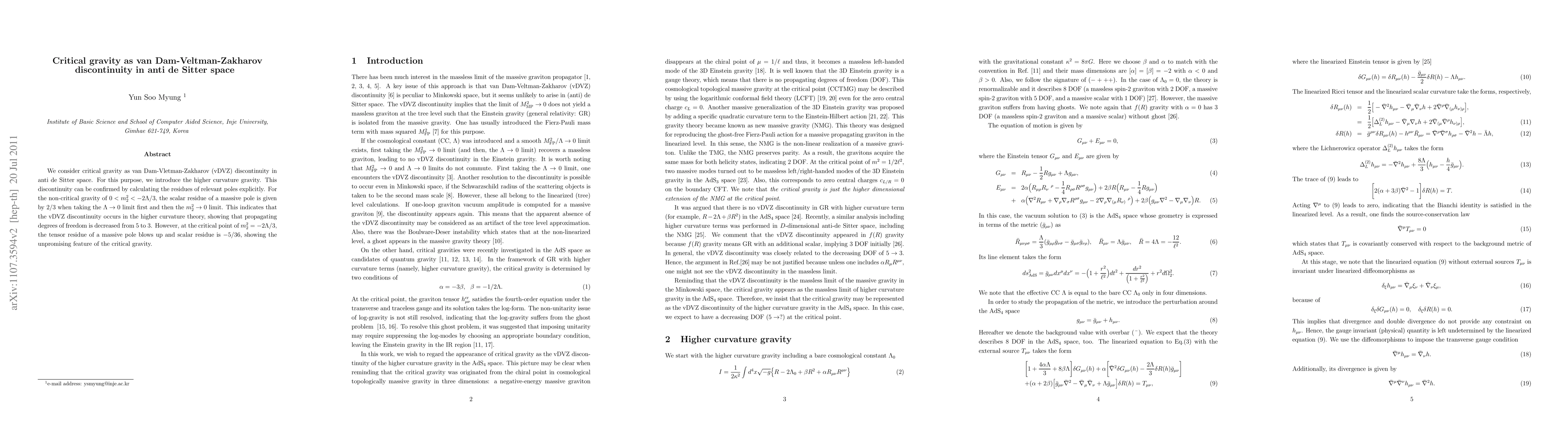 We consider critical gravity as van Dam-Vletman-Zakharov (vDVZ) discontinuity