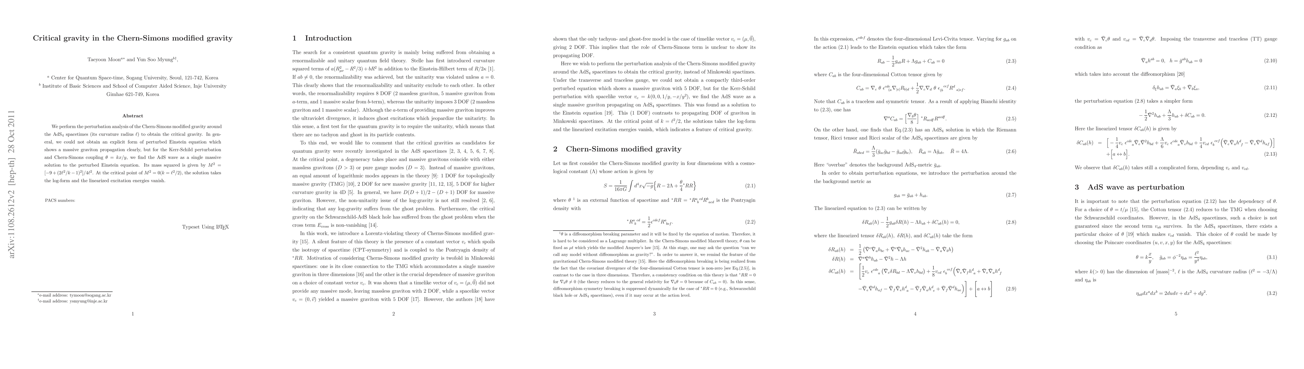 This paper investigates the perturbation analysis of Chern-Simons modified gravity around AdS$_4$ spacetime, revealing a single massive solution in specific perturbations. At the critical point where linearized excitation energies vanish, the solution takes a logarithmic form.