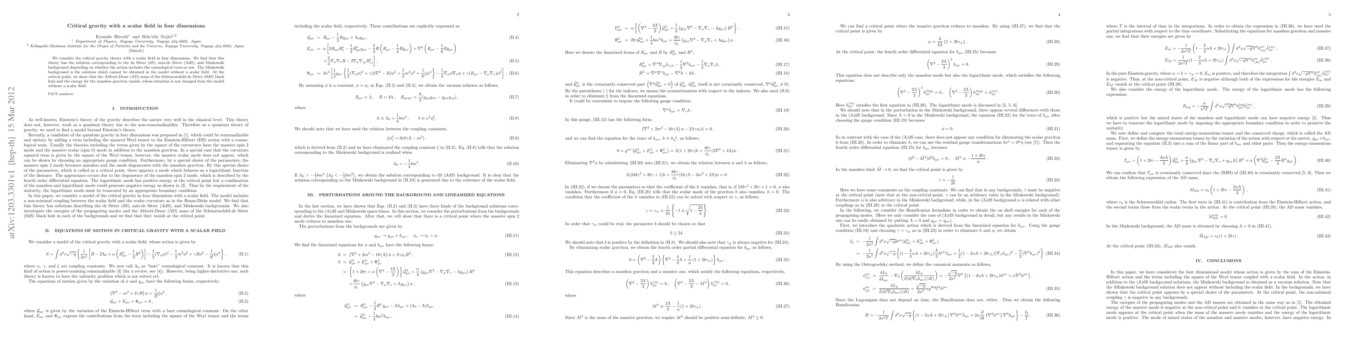 This paper explores critical gravity with a scalar field in four dimensions, revealing solutions for de Sitter, anti-de Sitter, and Minkowski backgrounds. The inclusion of a scalar field allows for the Minkowski solution, which is absent in models without it, and at the critical point, the AD mass of the Schwarzschild-de Sitter black hole and massless graviton energy vanish.