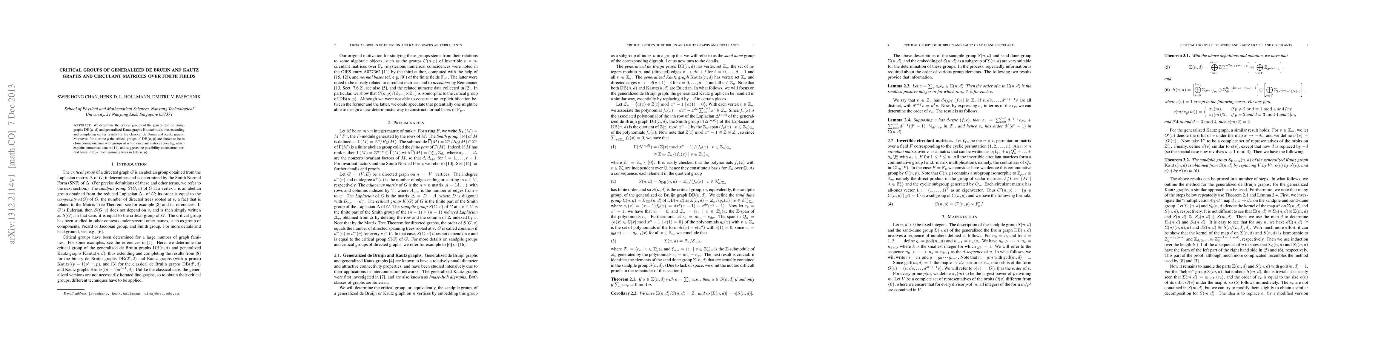 This paper determines the critical groups of generalized de Bruijn and Kautz graphs, extending previous results. It also reveals a close correspondence between the critical groups of DB$(n,p)$ and $n\times n$ circulant matrices over $\mathbb{F}_p$, suggesting a method to construct normal bases in $\mathbb{F}_{p^n}$ using spanning trees in DB$(n,p)$.