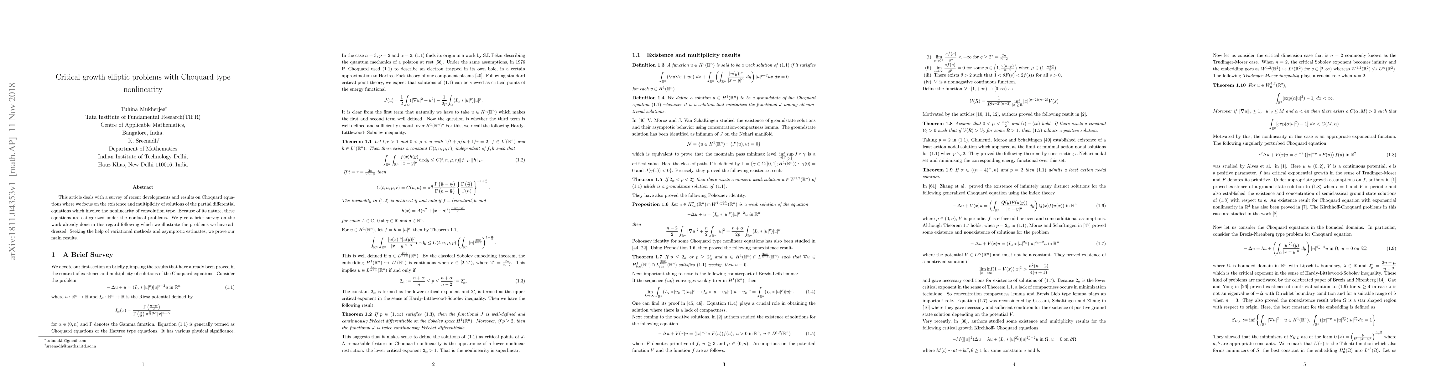This article deals with a survey of recent developments and results on Choquard equations where we focus on the existence and multiplicity of solutions of the partial differential equations which involve the nonlinearity of convolution type. Because of its nature, these equations are categorized under the nonlocal problems. We give a brief survey on the work already done in this regard following which we illustrate the problems we have addressed. Seeking the help of variational methods and asymptotic estimates, we prove our main results.