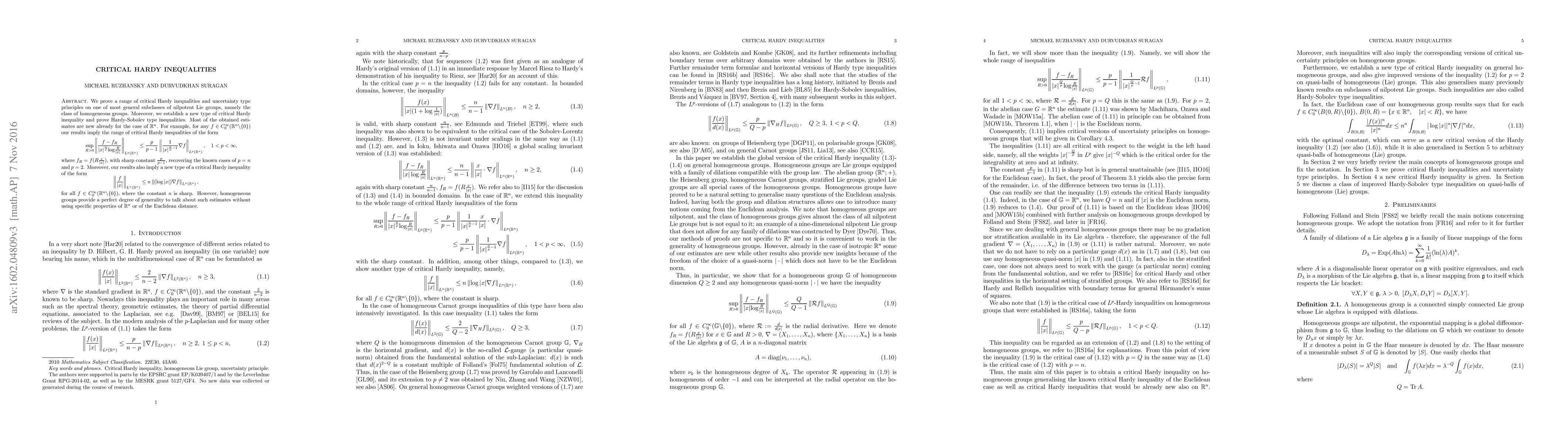 We prove a range of critical Hardy inequalities and uncertainty type principles on one of most general subclasses of nilpotent Lie groups, namely the class of homogeneous groups. Moreover, we establish a new type of critical Hardy inequality and prove Hardy-Sobolev type inequalities. Most of the obtained estimates are new already for the case of $\mathbb R^{n}$. For example, for any $f\in C_{0}^{\infty}(\mathbb{R}^{n}\backslash\{0\})$ our results imply the range of critical Hardy inequalities of the form $$\qquad \underset{R>0}{\sup}\left\|\frac{f-f_{R}}{|x|^{\frac{n}{p}}{\log}\frac{R}{|x|}}\right\|_{L^{p}(\mathbb{R}^{n})}\leq \frac{p}{p-1}\left\| \frac{1}{|x|^{\frac{n}{p}-1}} \nabla f\right\|_{L^{p}(\mathbb{R}^{n})},\quad 1