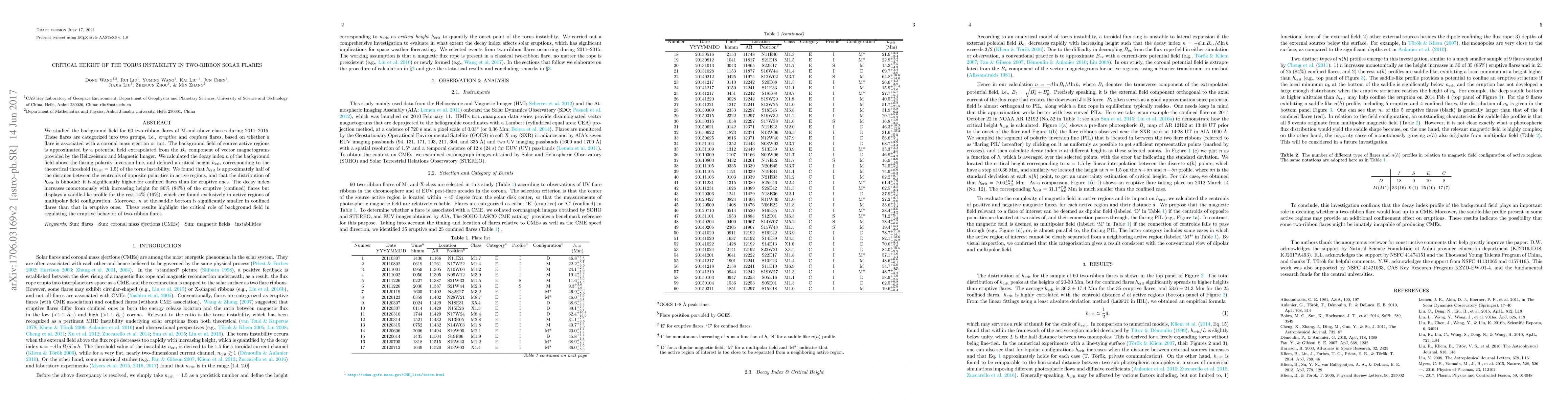 This paper investigates the critical height ($h_\mathrm{crit}$) associated with the torus instability in two-ribbon solar flares, finding that $h_\mathrm{crit}$ is significantly higher for confined flares compared to eruptive ones. The study reveals a bimodal distribution of $h_\mathrm{crit}$ and suggests that background magnetic field configuration plays a crucial role in determining flare behavior.