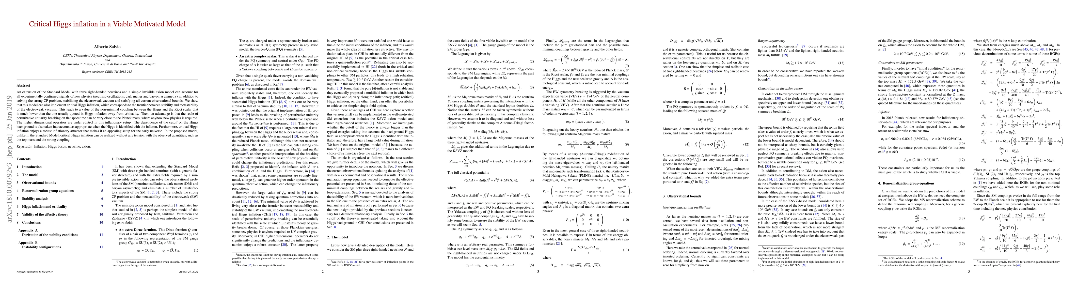 This paper proposes an extension of the Standard Model incorporating three right-handed neutrinos and an invisible axion model to explain neutrino oscillations, dark matter, baryon asymmetry, and the strong CP problem. It demonstrates that this model can implement critical Higgs inflation, resulting in a lower non-minimal coupling and a perturbative unitarity scale close to the Planck mass, while maintaining robustness and compatibility with observed quantities.
