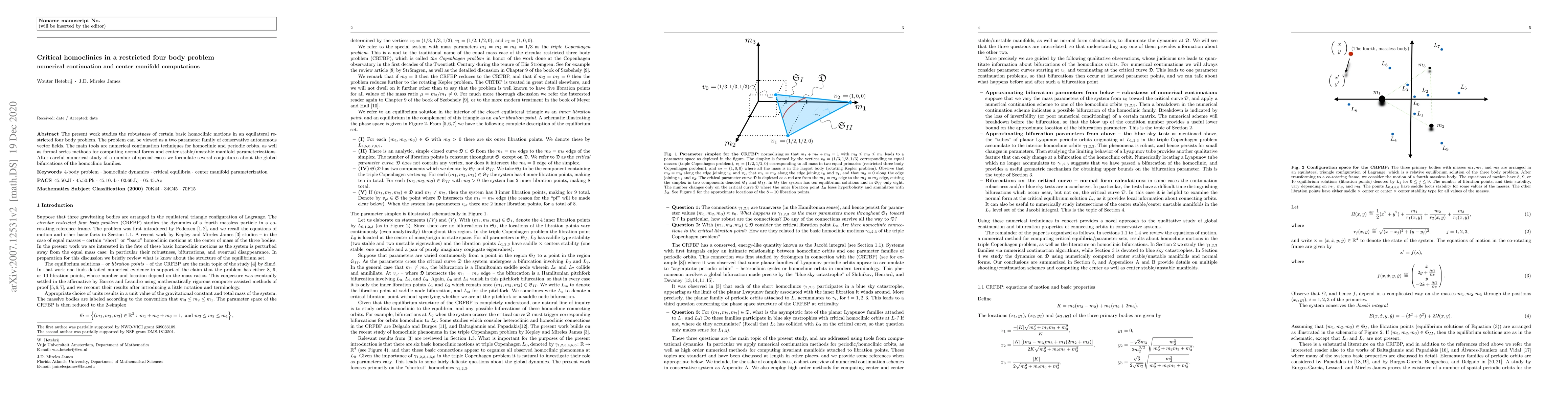 The study investigates the robustness of basic homoclinic motions in an equilateral restricted four body problem using numerical continuation and center manifold computations, and proposes conjectures on global bifurcations of homoclinic families.