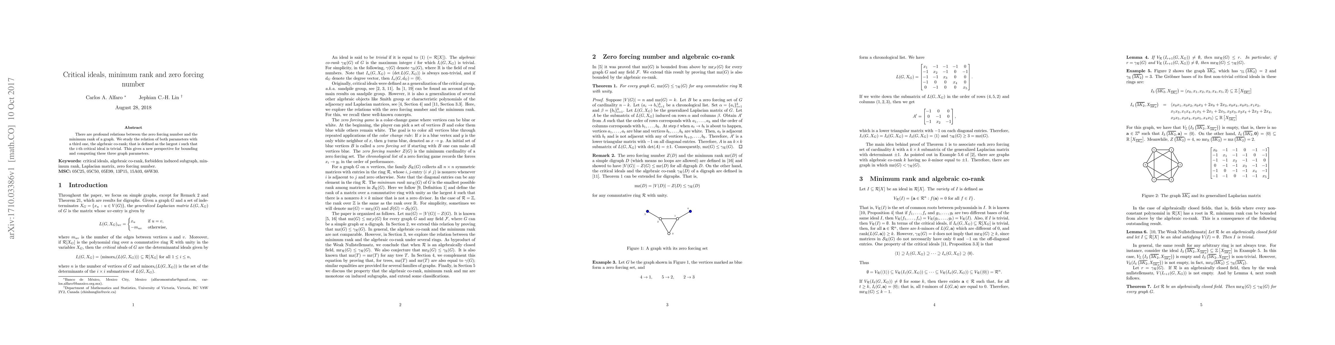 This paper explores the relationships between the zero forcing number, minimum rank, and algebraic co-rank of a graph, offering new insights and methods for bounding these parameters. The algebraic co-rank is defined by the largest trivial critical ideal, providing a fresh perspective on graph theory.