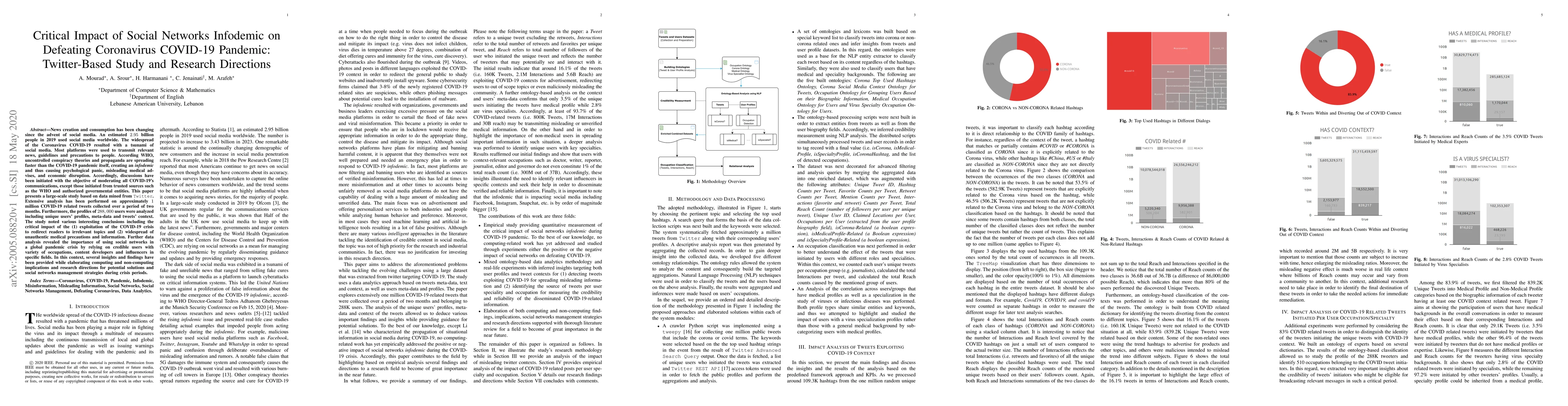 News creation and consumption has been changing since the advent of social media. An estimated 2.95 billion people in 2019 used social media worldwide. The widespread of the Coronavirus COVID-19 resulted with a tsunami of social media. Most platforms were used to transmit relevant news, guidelines and precautions to people. According to WHO, uncontrolled conspiracy theories and propaganda are spreading faster than the COVID-19 pandemic itself, creating an infodemic and thus causing psychological panic, misleading medical advises, and economic disruption. Accordingly, discussions have been initiated with the objective of moderating all COVID-19 communications, except those initiated from trusted sources such as the WHO and authorized governmental entities. This paper presents a large-scale study based on data mined from Twitter. Extensive analysis has been performed on approximately one million COVID-19 related tweets collected over a period of two months. Furthermore, the profiles of 288,000 users were analyzed including unique users profiles, meta-data and tweets context. The study noted various interesting conclusions including the critical impact of the (1) exploitation of the COVID-19 crisis to redirect readers to irrelevant topics and (2) widespread of unauthentic medical precautions and information. Further data analysis revealed the importance of using social networks in a global pandemic crisis by relying on credible users with variety of occupations, content developers and influencers in specific fields. In this context, several insights and findings have been provided while elaborating computing and non-computing implications and research directions for potential solutions and social networks management strategies during crisis periods.