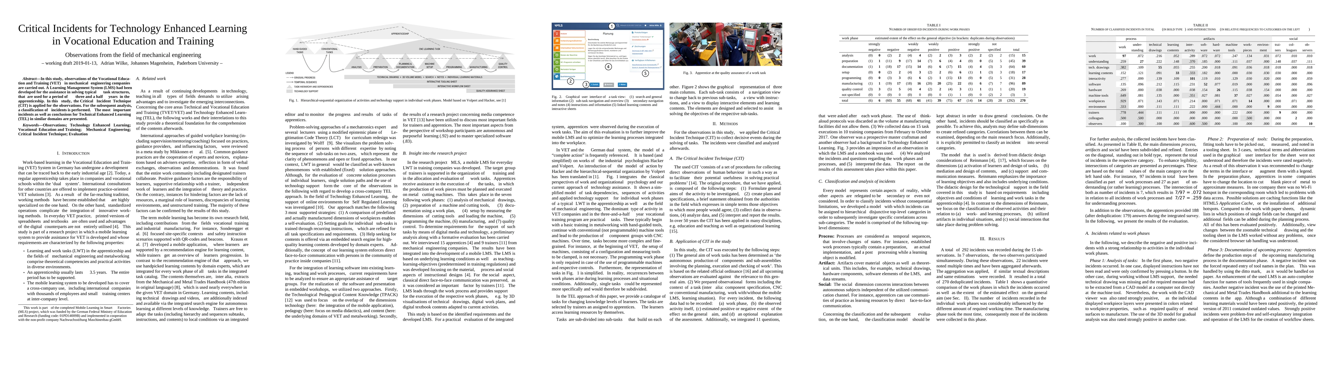 In this study, observations of the Vocational Education and Training (VET) in mechanical engineering companies are carried out. A Learning Management System (LMS) had been developed for the assistance in solving typical task structures, that are used for a period of three and a half years in the apprenticeship. In this study, the Critical Incident Technique (CIT) is applied for the observations. For the subsequent analysis, a classification of incidents is performed. The most important incidents as well as conclusions for Technical Enhanced Learning (TEL) in similar domains are presented.