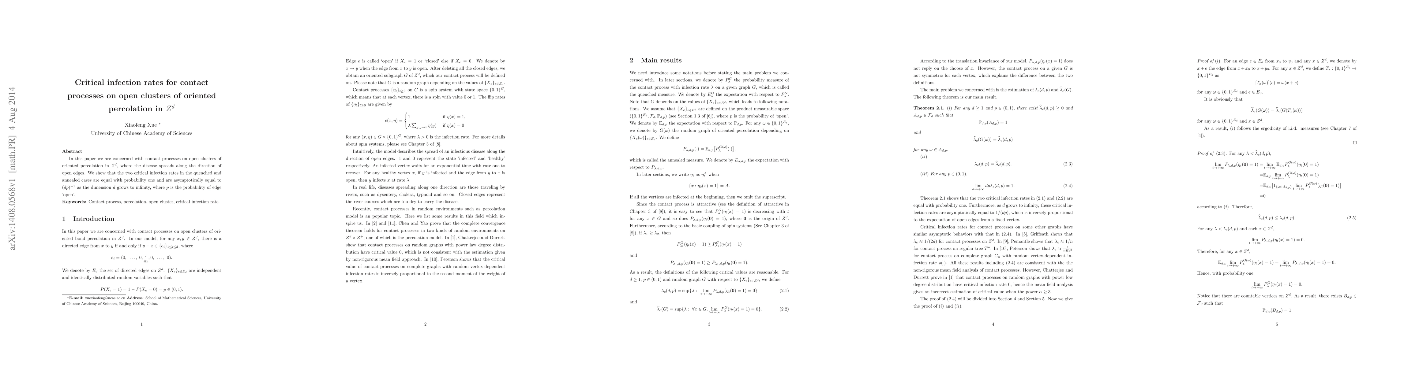 This paper investigates contact processes on open clusters of oriented percolation in $Z^d$, demonstrating that the critical infection rates for both quenched and annealed cases converge to $(dp)^{-1}$ as the dimension $d$ tends to infinity, with $p$ being the probability of an edge being open.
