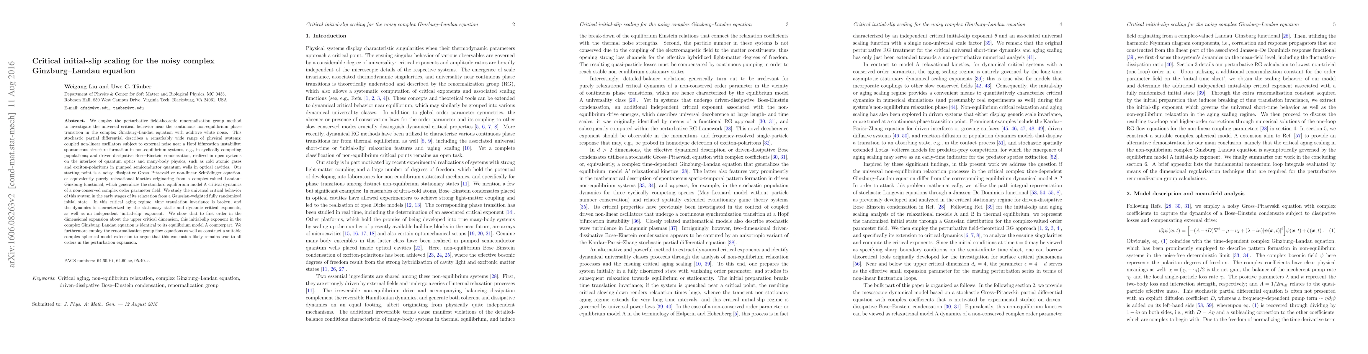 We employ the perturbative field-theoretic renormalization group method to investigate the universal critical behavior near the continuous non-equilibrium phase transition in the complex Ginzburg-Landau equation with additive white noise. This stochastic partial differential describes a remarkably wide range of physical systems: coupled non-linear oscillators subject to external noise near a Hopf bifurcation instability; spontaneous structure formation in non-equilibrium systems, e.g., in cyclically competing populations; and driven-dissipative Bose--Einstein condensation, realized in open systems on the interface of quantum optics and many-body physics, such as cold atomic gases and exciton-polaritons in pumped semiconductor quantum wells in optical cavities. Our starting point is a noisy, dissipative Gross-Pitaevski or non-linear Schr\"odinger equation, or equivalently purely relaxational kinetics originating from a complex-valued Landau-Ginzburg functional, which generalizes the standard equilibrium model A critical dynamics of a non-conserved complex order parameter field. We study the universal critical behavior of this system in the early stages of its relaxation from a Gaussian-weighted fully randomized initial state. In this critical aging regime, time translation invariance is broken, and the dynamics is characterized by the stationary static and dynamic critical exponents, as well as an independent `initial-slip' exponent. We show that to first order in the dimensional expansion about the upper critical dimension, this initial-slip exponent in the complex Ginzburg-Landau equation is identical to its equilibrium model A counterpart. We furthermore employ the renormalization group flow equations as well as construct a suitable complex spherical model extension to argue that this conclusion likely remains true to all orders in the perturbation expansion.