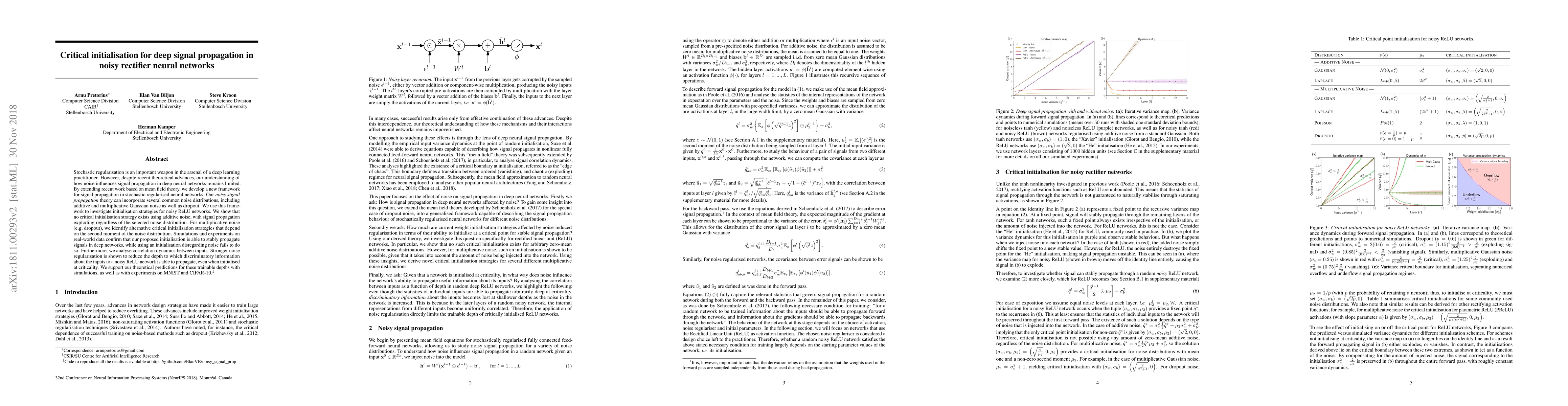 This paper develops a theoretical framework for understanding signal propagation in stochastically regularised neural networks, particularly focusing on noisy rectifier (ReLU) networks. It finds that while no critical initialisation strategy exists for additive noise, multiplicative noise like dropout allows for such strategies, which depend on the noise's second moment. Experiments confirm the effectiveness of the proposed initialisation methods in stable signal propagation.