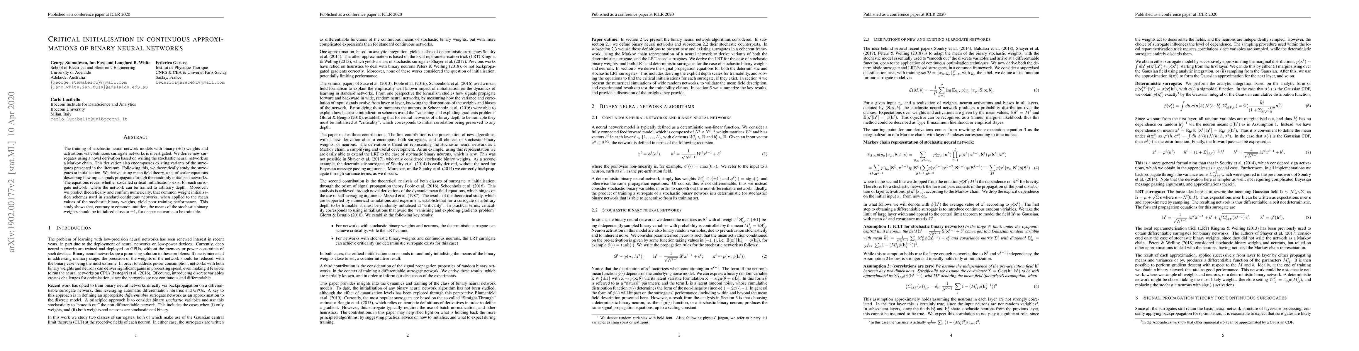 This paper investigates the training of binary neural networks using continuous surrogates, deriving new surrogates based on a Markov chain approach. It reveals that critical initialisations exist for these networks, and contrary to standard practice, initialising the mean values of stochastic binary weights close to $\pm 1$ is necessary for effective training of deeper networks.