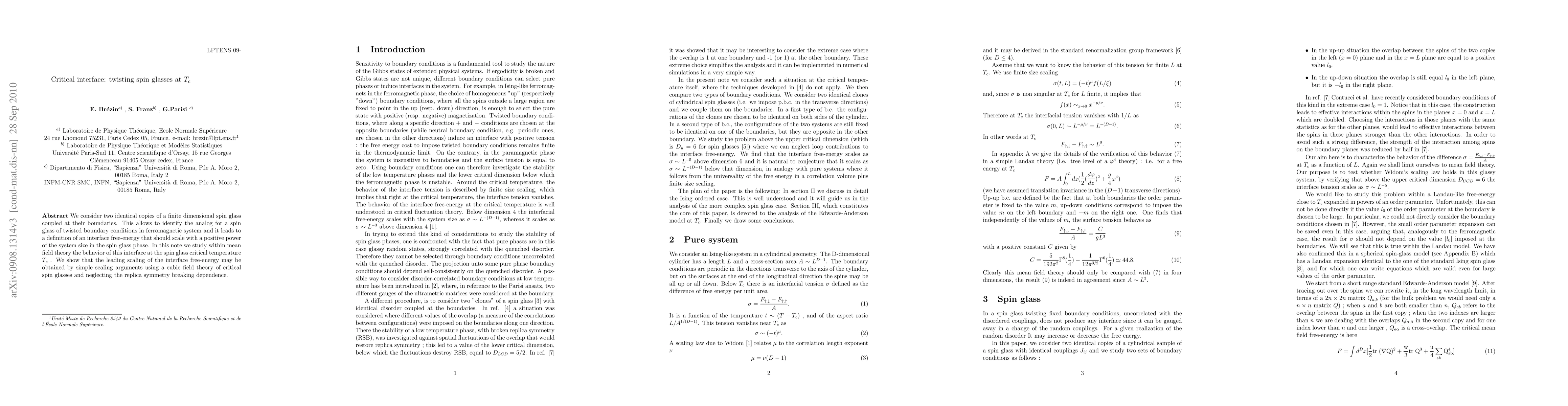 We consider identical copies of spin glasses in finite dimension coupled at the boundaries. This allows to identify the spin glass analogous of twisted boundary conditions in ferromagnetic system and leads to the definition of an interface free-energy that is positively defined and that should scale with a positive power of the system size in the spin glass phase. In this note we study the behavior of the interface at the spin glass critical temperature $T_c$ within mean field theory. We show that the leading scaling of the interface free-energy does not depend on replica symmetry breaking, and can be obtained by simple scaling arguments using a cubic theory for critical spin glasses.