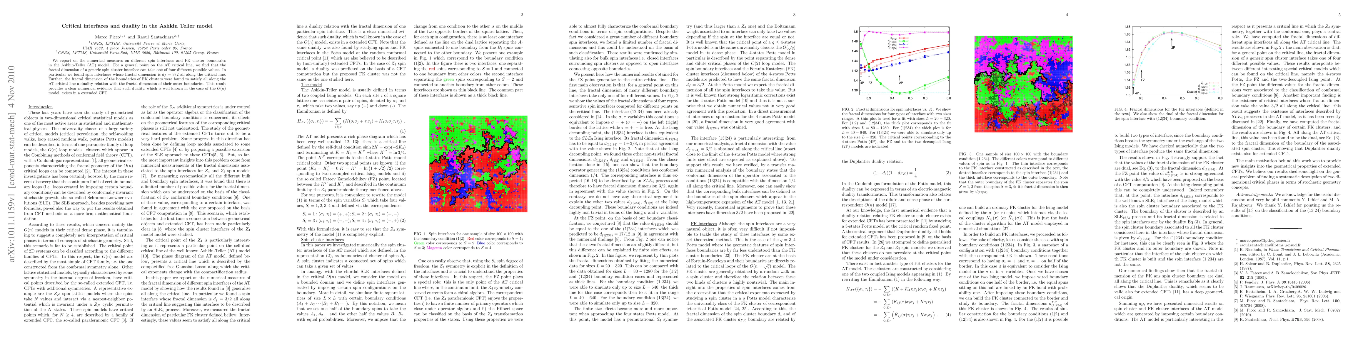This paper reports numerical findings on the Ashkin-Teller (AT) model, revealing four possible fractal dimensions for spin interfaces along the critical line, including d_f=3/2. It also uncovers a duality relation between the fractal dimensions of FK cluster boundaries and their outer boundaries, extending known duality to the extended conformal field theory.