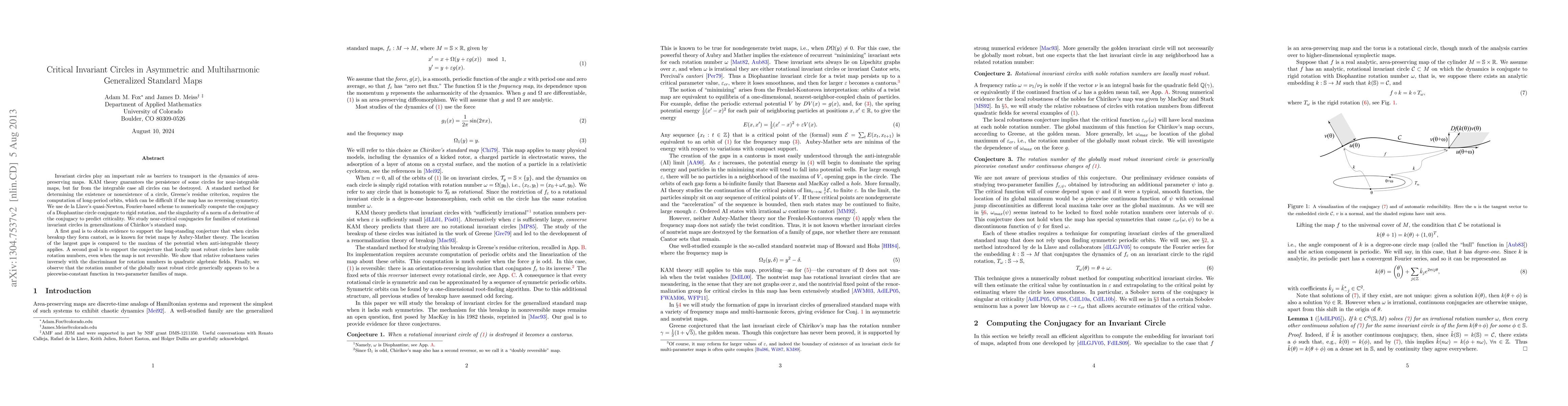 This paper investigates the dynamics of asymmetric and multiharmonic generalized standard maps, focusing on invariant circles' persistence and breakup. It uses numerical methods to support the conjecture that breakup leads to cantori and that most robust circles have noble rotation numbers, showing that relative robustness inversely correlates with the discriminant for quadratic algebraic fields.