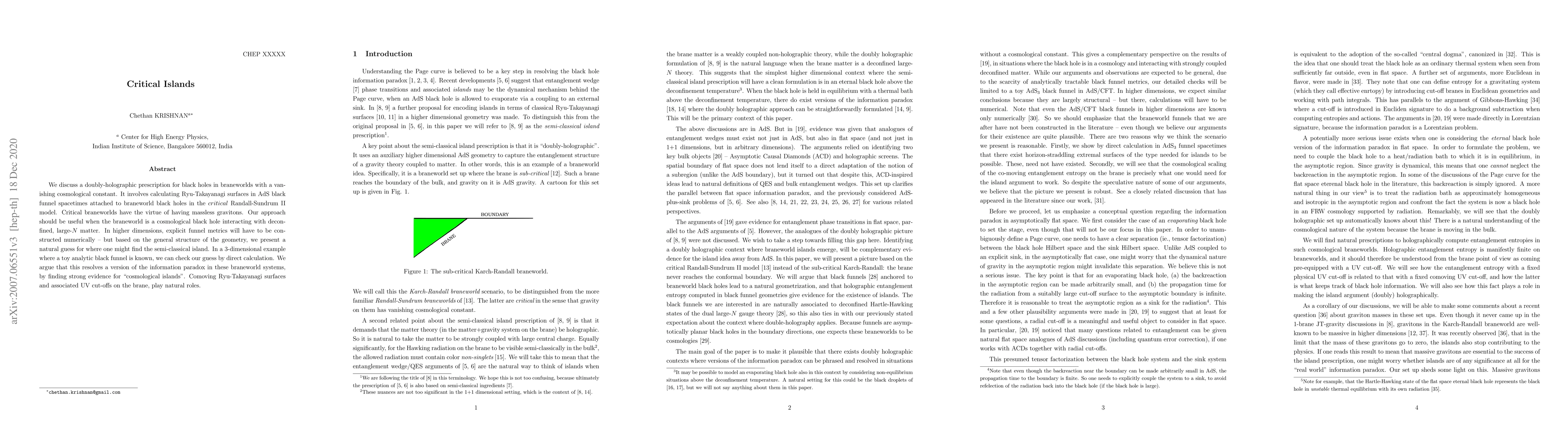 We discuss a doubly-holographic prescription for black holes in braneworlds with a vanishing cosmological constant. It involves calculating Ryu-Takayanagi surfaces in AdS black funnel spacetimes attached to braneworld black holes in the $ critical$ Randall-Sundrum II model. Critical braneworlds have the virtue of having massless gravitons. Our approach should be useful when the braneworld is a cosmological black hole interacting with deconfined, large-$N$ matter. In higher dimensions, explicit funnel metrics will have to be constructed numerically -- but based on the general structure of the geometry, we present a natural guess for where one might find the semi-classical island. In a 3-dimensional example where a toy analytic black funnel is known, we can check our guess by direct calculation. We argue that this resolves a version of the information paradox in these braneworld systems, by finding strong evidence for "cosmological islands". Comoving Ryu-Takayanagi surfaces and associated UV cut-offs on the brane, play natural roles.