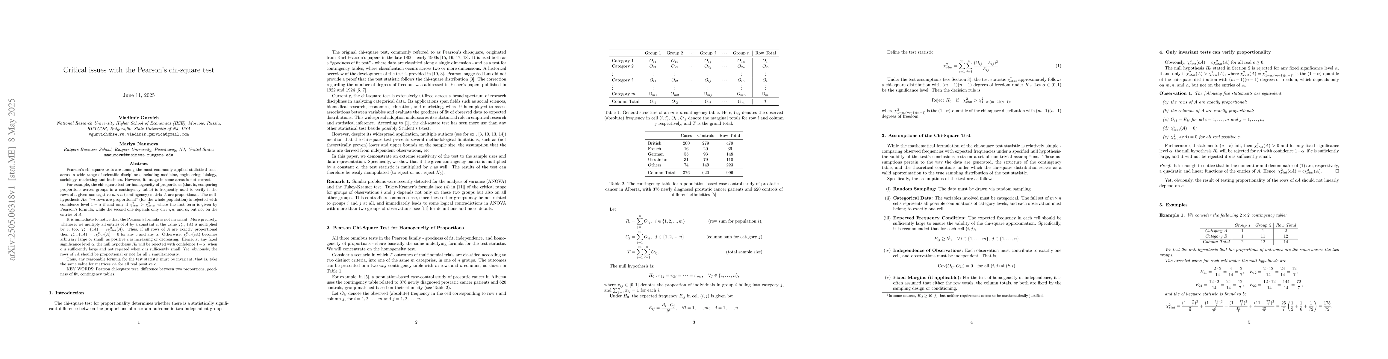The paper critiques the application of Pearson's chi-square test, particularly in testing proportionality of rows in a contingency table.