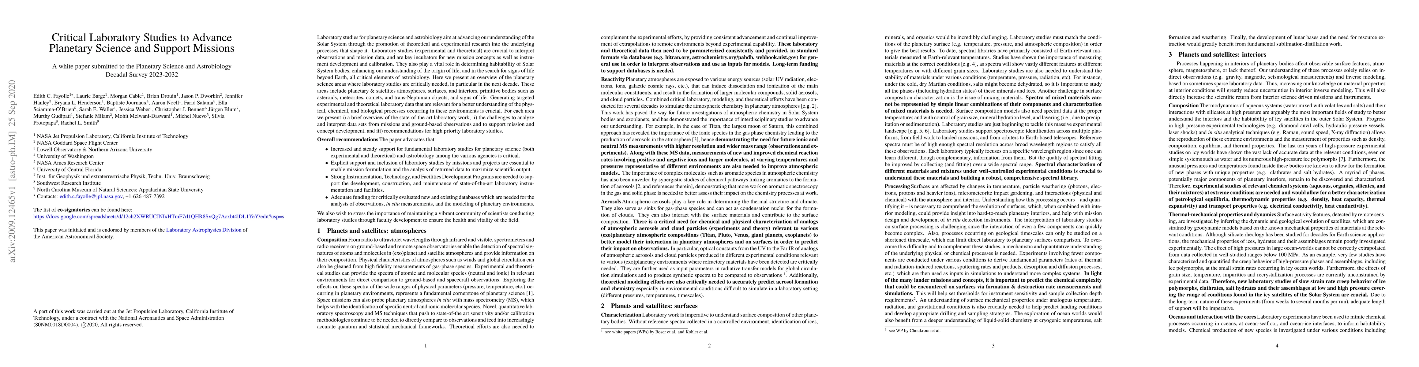 Laboratory studies in planetary science aim to advance our understanding of the Solar System through experimentation and theoretical research. Key areas requiring targeted laboratory work include planetary atmospheres, surfaces, interiors, and signs of life, with a focus on data analysis and interpretation for future missions.