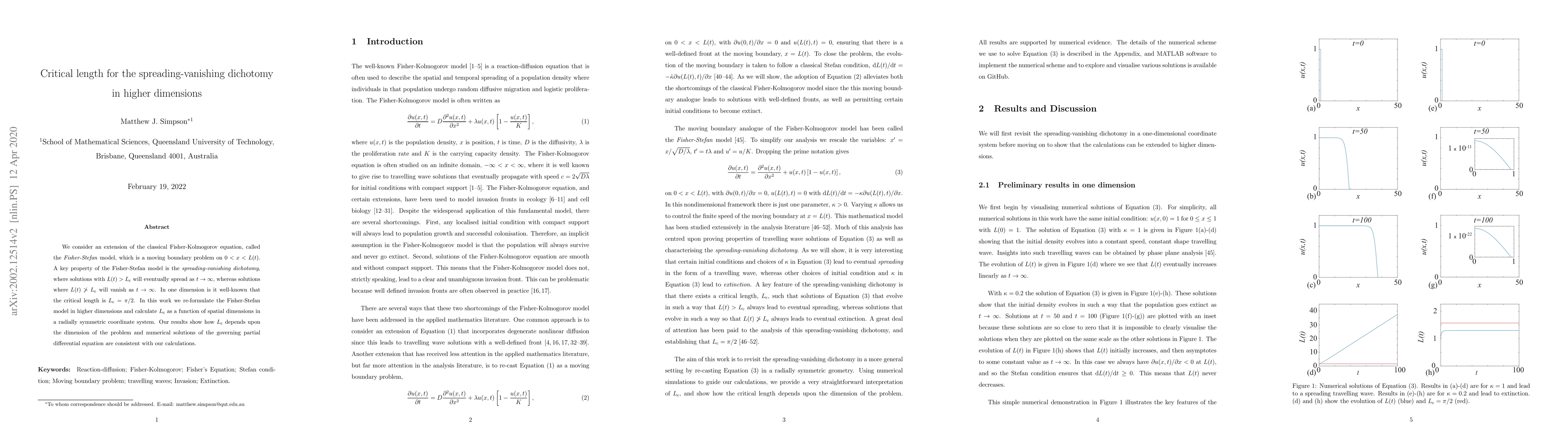 Researchers re-examined the spreading-vanishing dichotomy in higher dimensions, finding that critical length $L_{ extrm{c}}$ depends on spatial dimensions and is consistent with numerical solutions.