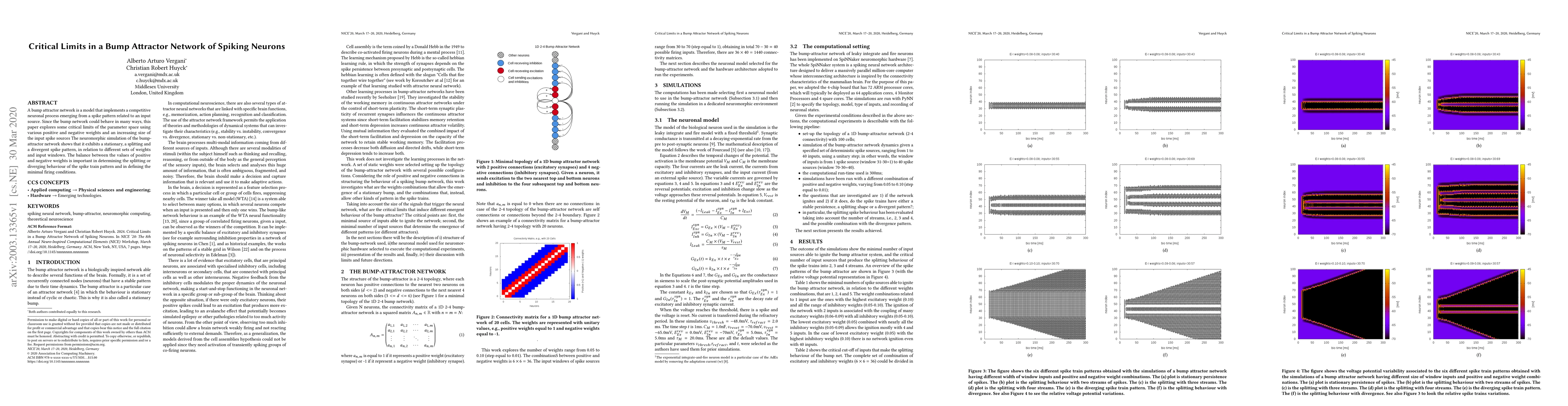 A bump attractor network is a model that implements a competitive neuronal process emerging from a spike pattern related to an input source. Since the bump network could behave in many ways, this paper explores some critical limits of the parameter space using various positive and negative weights and an increasing size of the input spike sources The neuromorphic simulation of the bumpattractor network shows that it exhibits a stationary, a splitting and a divergent spike pattern, in relation to different sets of weights and input windows. The balance between the values of positive and negative weights is important in determining the splitting or diverging behaviour of the spike train pattern and in defining the minimal firing conditions.