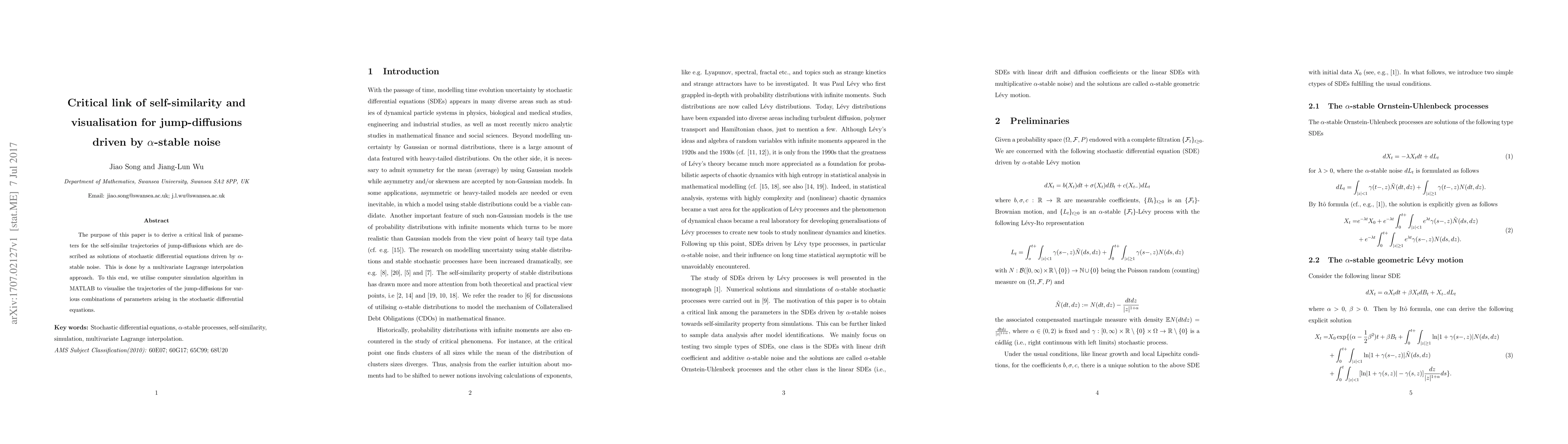 The purpose of this paper is to derive a critical link of parameters for the self-similar trajectories of jump-diffusions which are described as solutions of stochastic differential equations driven by $\alpha$-stable noise. This is done by a multivariate Lagrange interpolation approach. To this end, we utilise computer simulation algorithm in MATLAB to visualise the trajectories of the jump-diffusions for various combinations of parameters arising in the stochastic differential equations.