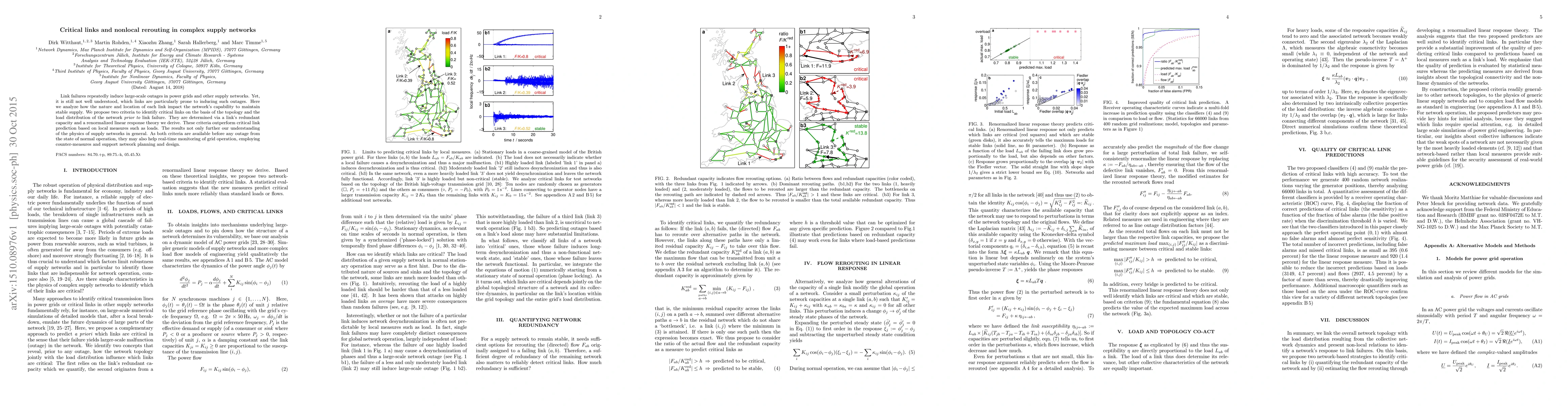 Link failures repeatedly induce large-scale outages in power grids and other supply networks. Yet, it is still not well understood, which links are particularly prone to inducing such outages. Here we analyze how the nature and location of each link impact the network's capability to maintain stable supply. We propose two criteria to identify critical links on the basis of the topology and the load distribution of the network prior to link failure. They are determined via a link's redundant capacity and a renormalized linear response theory we derive. These criteria outperform critical link prediction based on local measures such as loads. The results not only further our understanding of the physics of supply networks in general. As both criteria are available before any outage from the state of normal operation, they may also help real-time monitoring of grid operation, employing counter-measures and support network planning and design.