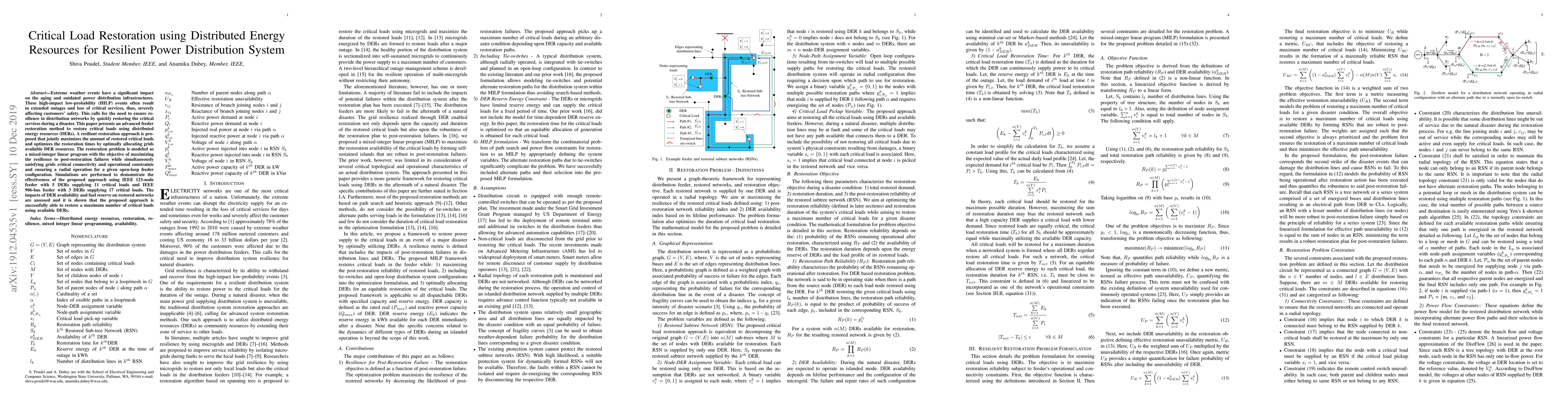 Extreme weather events have a significant impact on the aging and outdated power distribution infrastructures. These high-impact low-probability (HILP) events often result in extended outages and loss of critical services, thus, severely affecting customers' safety. This calls for the need to ensure resilience in distribution networks by quickly restoring the critical services during a disaster. This paper presents an advanced feeder restoration method to restore critical loads using distributed energy resources (DERs). A resilient restoration approach is proposed that jointly maximizes the amount of restored critical loads and optimizes the restoration times by optimally allocating grid's available DER resources. The restoration problem is modeled as a mixed-integer linear program with the objective of maximizing the resilience to post-restoration failures while simultaneously satisfying grid's critical connectivity and operational constraints and ensuring a radial operation for a given open-loop feeder configuration. Simulations are performed to demonstrate the effectiveness of the proposed approach using IEEE 123-node feeder with 5 DERs supplying 11 critical loads and IEEE 906-bus feeder with 3 DERs supplying 17 critical loads. The impacts of DER availability and fuel reserve on restored networks are assessed and it is shown that the proposed approach is successfully able to restore a maximum number of critical loads using available DERs.