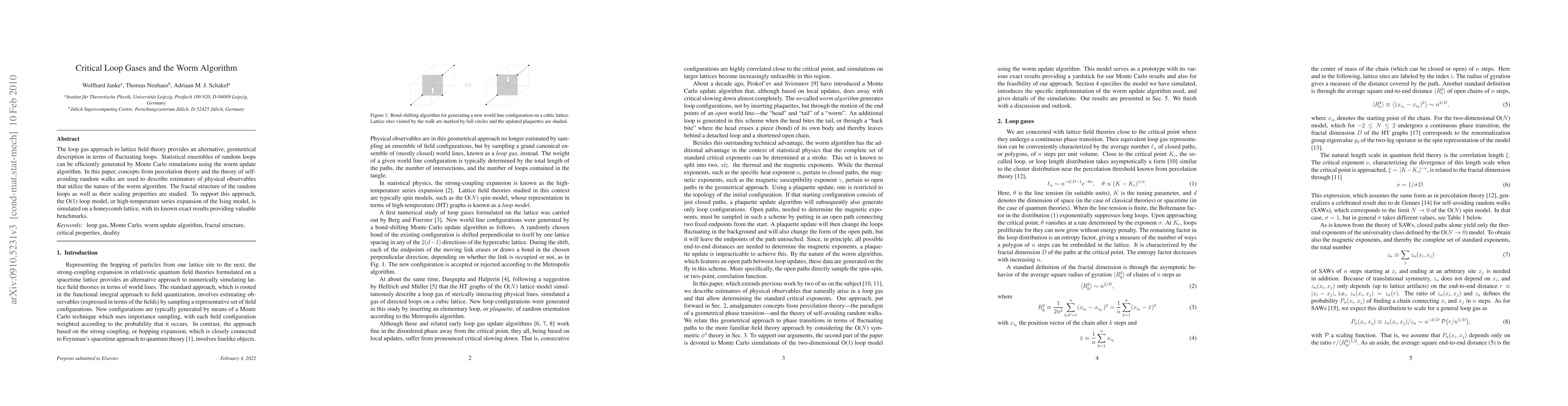This paper explores the loop gas approach in lattice field theory using the worm algorithm for efficient Monte Carlo simulations, employing concepts from percolation theory and self-avoiding random walks to analyze the fractal structure and scaling properties of random loops. Simulations of the O(1) loop model on a honeycomb lattice provide benchmarks for validating the approach.