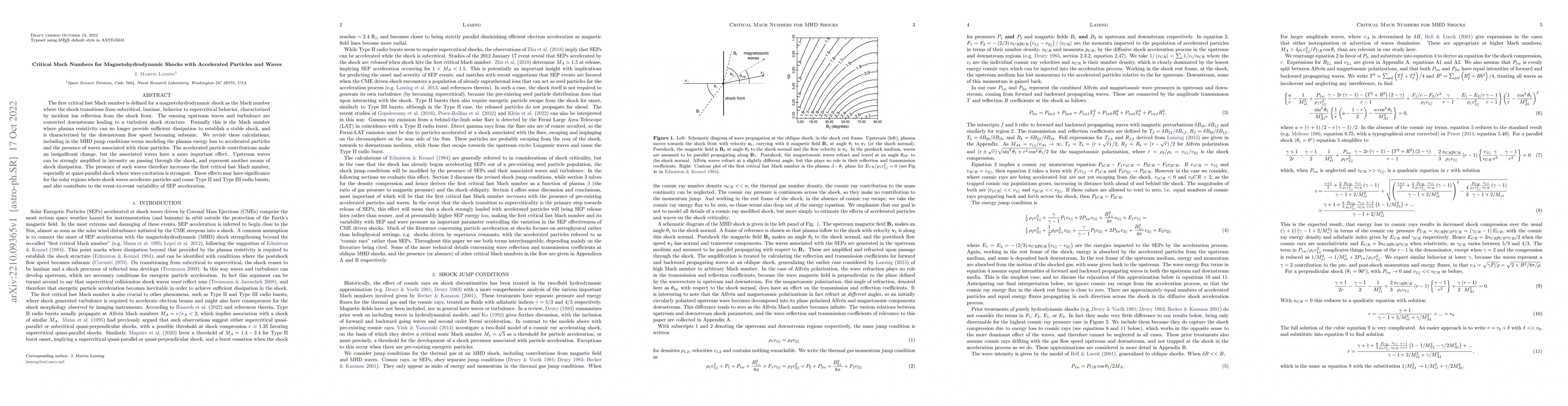 The first critical fast Mach number is defined for a magnetohydrodynamic shock as the Mach number where the shock transitions from subcritical, laminar, behavior to supercritical behavior, characterized by incident ion reflection from the shock front. The ensuing upstream waves and turbulence are convected downstream leading to a turbulent shock structure. Formally this is the Mach number where plasma resistivity can no longer provide sufficient dissipation to establish a stable shock, and is characterized by the downstream flow speed becoming subsonic. We revisit these calculations, including in the MHD jump conditions terms modeling the plasma energy loss to accelerated particles and the presence of waves associated with these particles. The accelerated particle contributions make an insignificant change, but the associated waves have a more important effect. Upstream waves can be strongly amplified in intensity on passing through the shock, and represent another means of shock dissipation. The presence of such waves therefore increases the first critical fast Mach number, especially at quasi-parallel shock where wave excitation is strongest. These effects may have significance for the solar regions where shock waves accelerate particles and cause Type II and Type III radio bursts, and also contribute to the event-to-event variability of SEP acceleration.