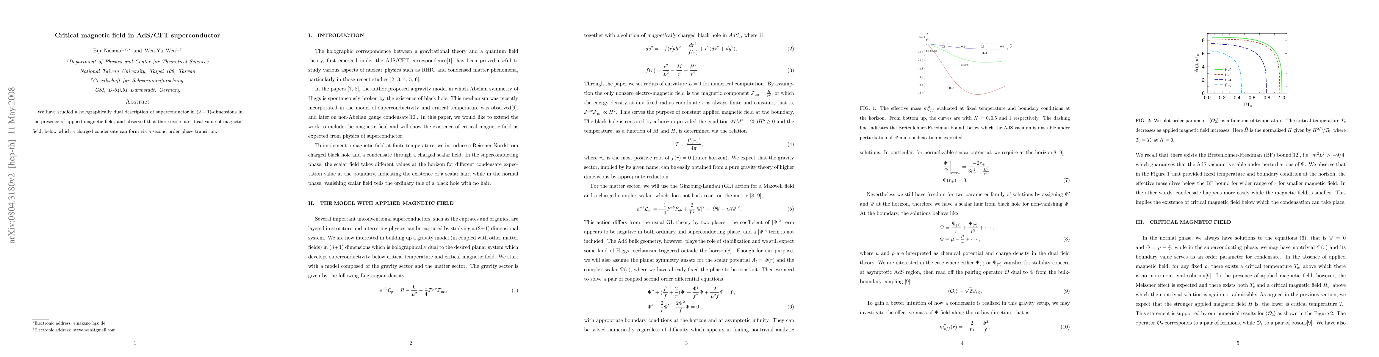 Summary: This research explores a holographic superconductor in (2+1) dimensions under an applied magnetic field, revealing a critical magnetic field threshold below which a charged condensate forms through a second-order phase transition.