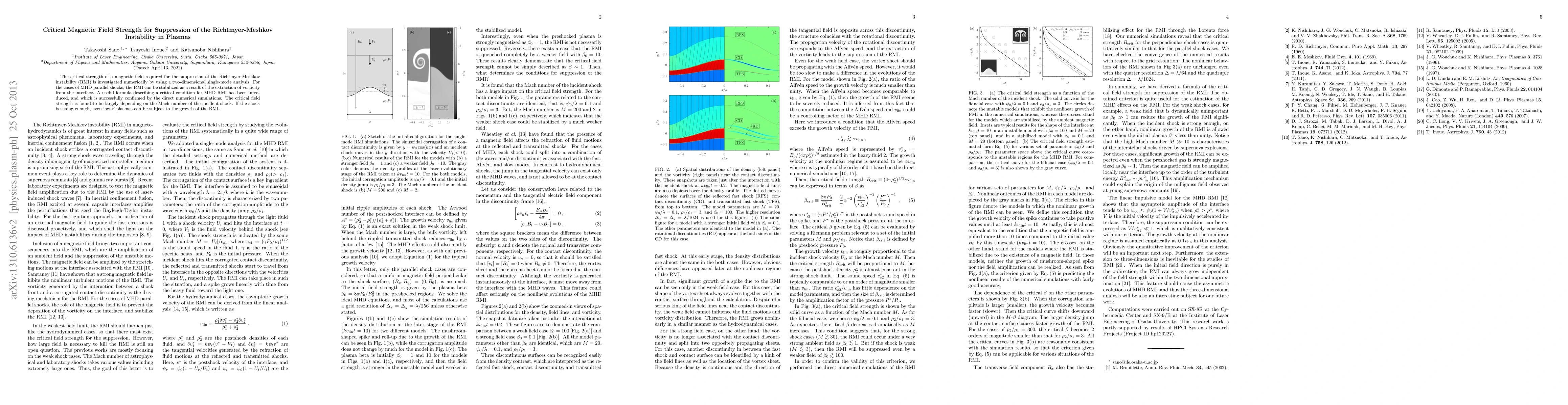 This paper investigates the critical magnetic field strength needed to suppress the Richtmyer-Meshkov instability in plasmas using numerical simulations. It finds that strong magnetic fields can stabilize the RMI by extracting vorticity, and introduces a formula for the critical condition, which is confirmed by simulations; the critical field strength is heavily dependent on the Mach number of the incident shock.