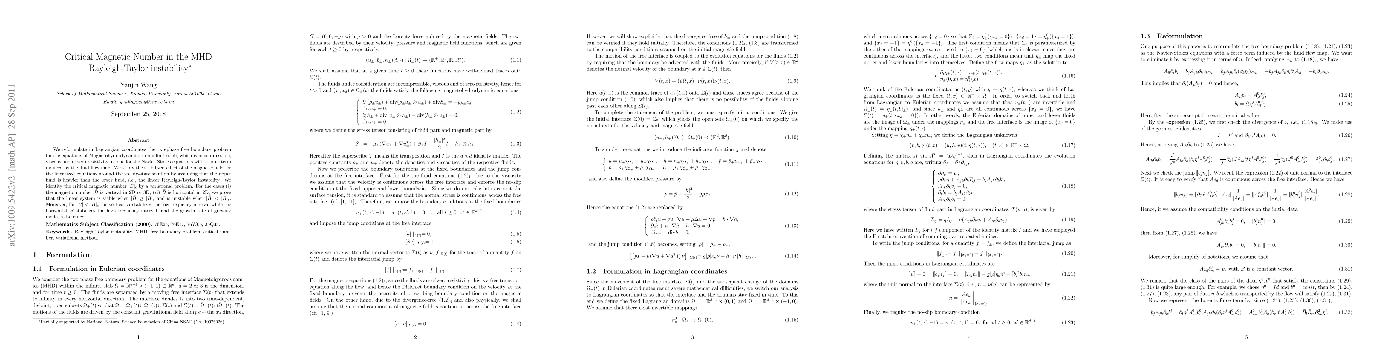 This paper reformulates the MHD Rayleigh-Taylor instability in Lagrangian coordinates and identifies a critical magnetic number $|B|_c$ that determines stability. It proves that the system is stable when the magnetic field strength $|\bar{B}|$ exceeds $|B|_c$ and unstable otherwise, with specific stabilization effects depending on the magnetic field orientation.