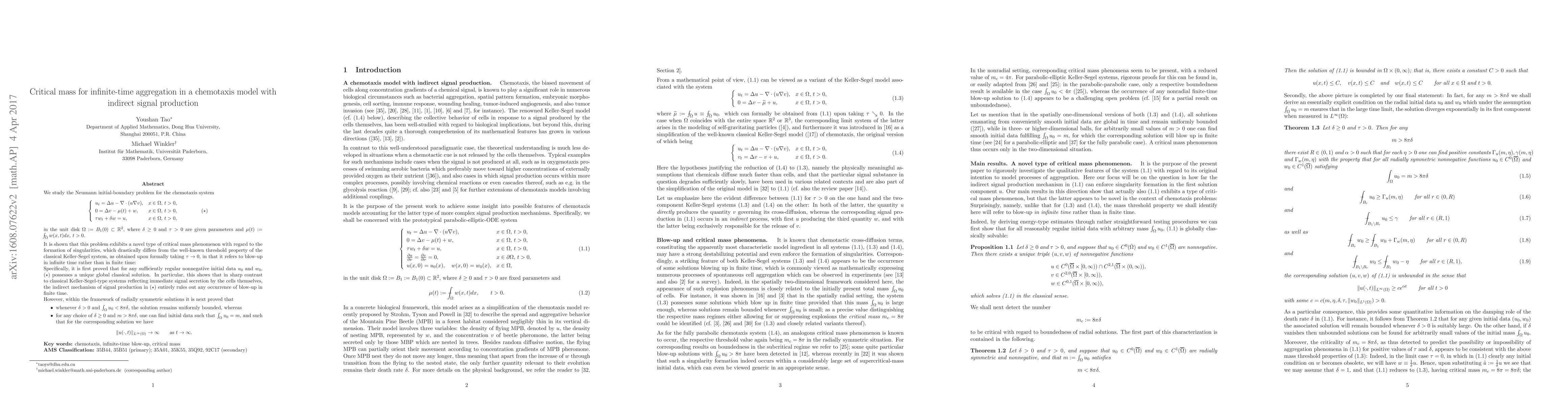 We study the Neumann initial-boundary problem for the chemotaxis system $$ \left\{\begin{array}{ll} u_t= \Delta u - \nabla \cdot (u\nabla v), & x\in \Omega, \, t>0, 0=\Delta v - \mu(t)+w, & x\in \Omega, \, t>0, \tau w_t + \delta w = u, & x\in \Omega, \, t>0, \end{array} \right. \qquad \qquad (\star) $$ in the unit disk $\Omega:=B_1(0)\subset \R^2$, where $\delta\ge 0$ and $\tau>0$ are given parameters and $\mu(t):=\mint_\Omega w(x,t)dx$, $t>0$. It is shown that this problem exhibits a novel type of critical mass phenomenon with regard to the formation of singularities, which drastically differs from the well-known threshold property of the classical Keller-Segel system, as obtained upon formally taking $\tau\to 0$, in that it refers to blow-up in infinite time rather than in finite time: Specifically, it is first proved that for any sufficiently regular nonnegative initial data $u_0$ and $w_0$, ($\star$) possesses a unique global classical solution. In particular, this shows that in sharp contrast to classical Keller-Segel-type systems reflecting immediate signal secretion by the cells themselves, the indirect mechanism of signal production in ($\star$) entirely rules out any occurrence of blow-up in finite time. However, within the framework of radially symmetric solutions it is next proved that whenever $\delta>0$ and $\io u_0<8\pi\delta$, the solution remains uniformly bounded, whereas for any choice of $\delta\ge 0$ and $m>8\pi\delta$, one can find initial data such that $\io u_0=m$, and such that for the corresponding solution we have \bas \|u(\cdot,t)\|_{L^\infty(\Omega)} \to \infty \qquad \mbox{as} t\to\infty.