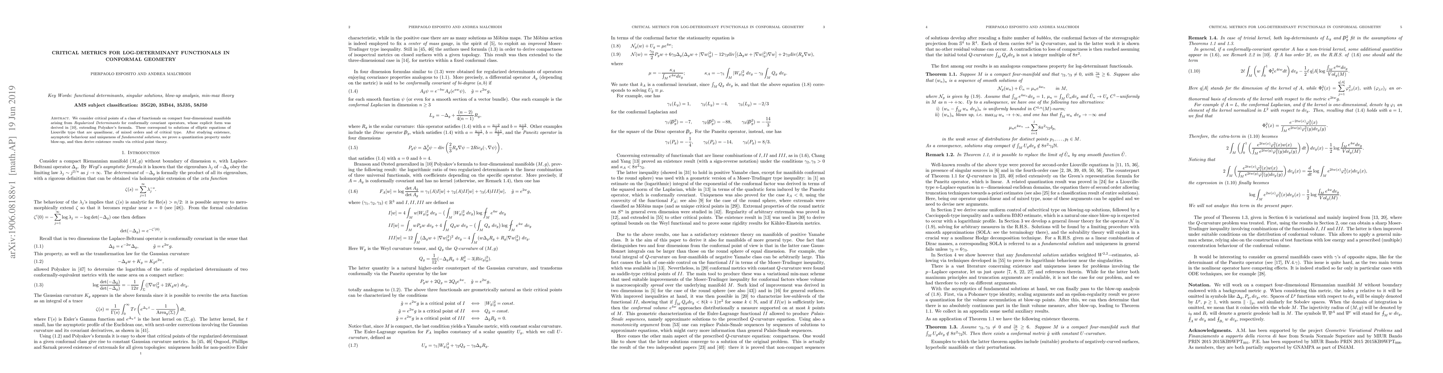We consider critical points of a class of functionals on compact four-dimensional manifolds arising from Regularized Determinants for conformally covariant operators, whose explicit form was derived in [10], extending Polyakov's formula. These correspond to solutions of elliptic equations of Liouville type that are quasilinear, of mixed orders and of critical type. After studying existence, asymptotic behaviour and uniqueness of fundamental solutions, we prove a quantization property under blow-up, and then derive existence results via critical point theory.