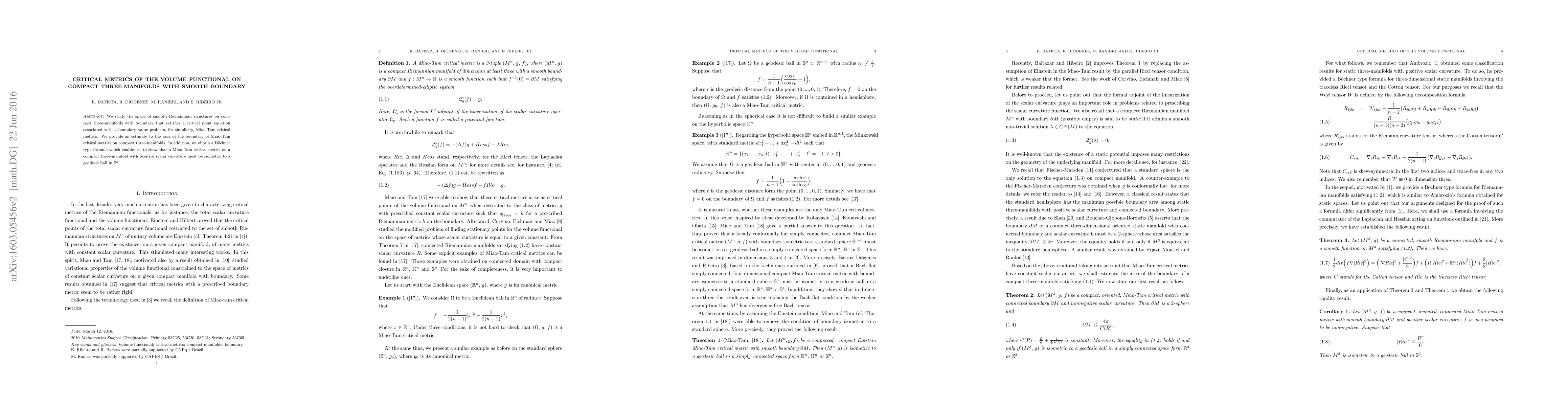 This paper investigates Riemannian structures on compact three-manifolds with boundary, focusing on Miao-Tam critical metrics. It provides an estimate for the boundary area and proves a B\"ochner type formula, showing that such metrics with positive scalar curvature are isometric to geodesic balls in $\Bbb{S}^3$.