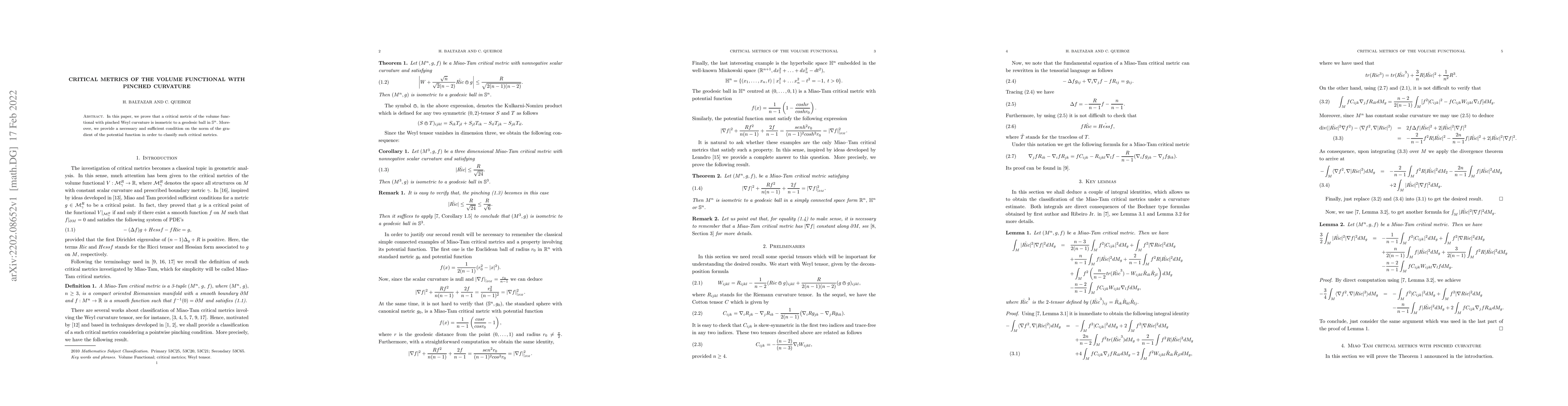 This paper proves that a critical metric of the volume functional with pinched Weyl curvature is isometric to a geodesic ball in $\mathbb{S}^{n}$. It also establishes a necessary and sufficient condition on the gradient of the potential function for classifying such critical metrics.