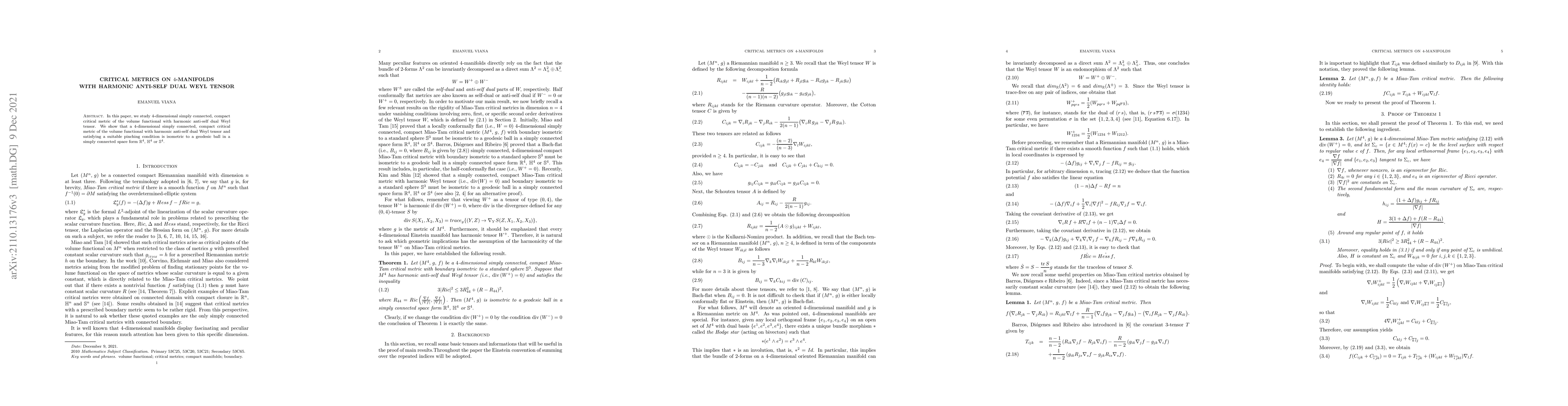 We prove that a $4$-dimensional simply connected, compact critical metric of the volume functional with harmonic anti-self dual Weyl tensor and boundary isometric to a standard sphere $\mathbb{S}^{3}$ is isometric to a geodesic ball in a simply connected space form $\mathbb{R}^{4}$, $\mathbb{H}^{4}$ or $\mathbb{S}^{4}.$