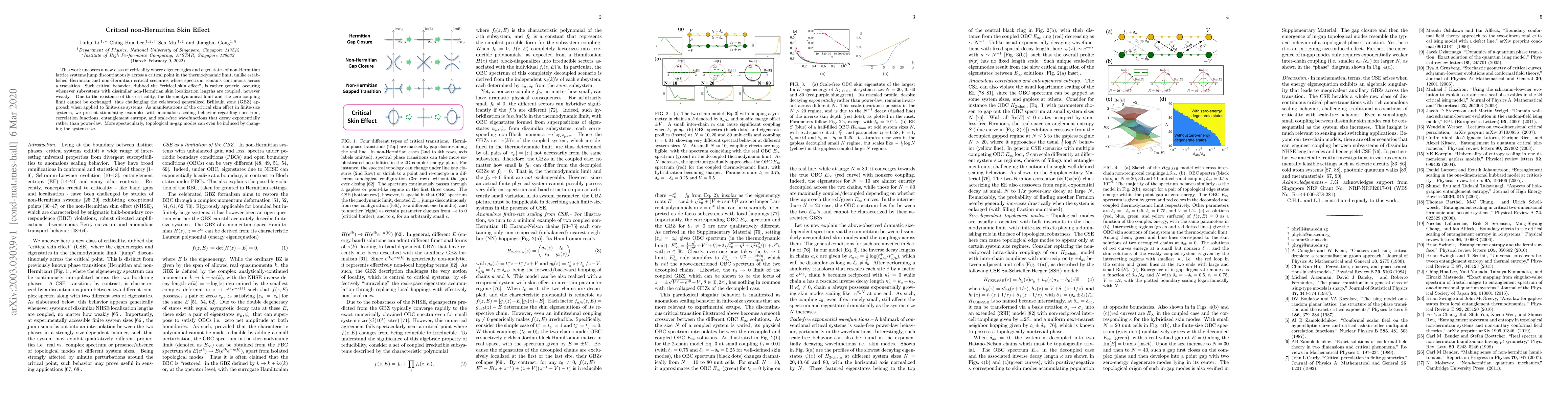 This paper introduces a novel "critical skin effect" in non-Hermitian lattice systems where eigenenergies and eigenstates show discontinuous jumps at critical points, challenging traditional notions of Hermitian and non-Hermitian criticality. The effect induces topological in-gap modes and anomalous scaling behaviors in finite-size systems.