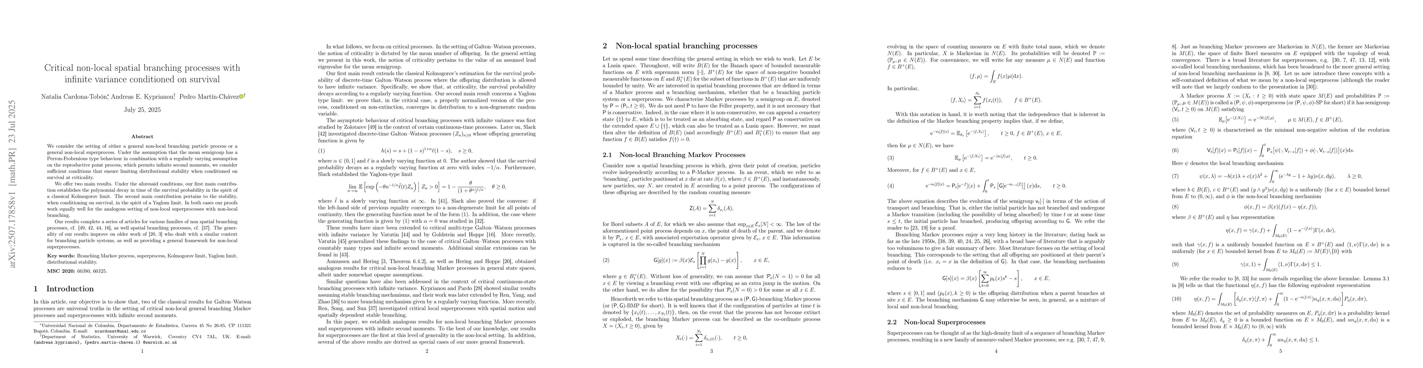 We consider the setting of either a general non-local branching particle process or a general non-local superprocess. Under the assumption that the mean semigroup has a Perron-Frobenious type behaviour in combination with a regularly varying assumption on the reproductive point process, which permits infinite second moments, we consider sufficient conditions that ensure limiting distributional stability when conditioned on survival at criticality. We offer two main results. Under the aforesaid conditions, our first main contribution establishes the polynomial decay in time of the survival probability in the spirit of a classical Kolmogorov limit. The second main contribution pertains to the stability, when conditioning on survival, in the spirit of a Yaglom limit. In both cases our proofs work equally well for the analogous setting of non-local superprocesses with non-local branching. Our results complete a series of articles for various families of non spatial branching processes from the 1950s-1970s as well complementing a recent result of this type for spatial branching processes of Ren, Song and Sun (2020) The generality of our results improve on older work of Hering and Hoppe (1981) and Asmussen and Hering (1983) who dealt with a similar context for branching particle systems, as well as providing a general framework for non-local superprocesses.
